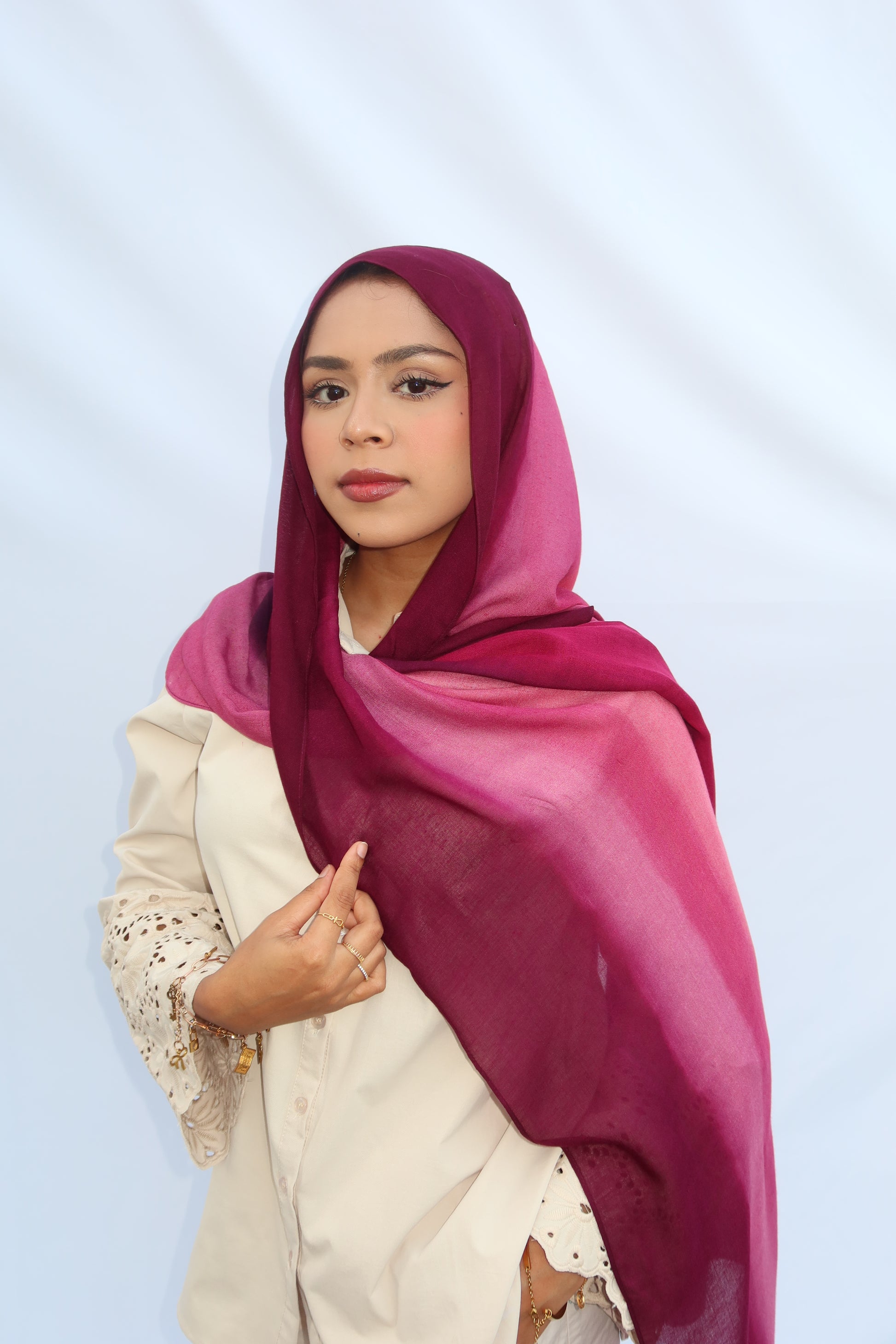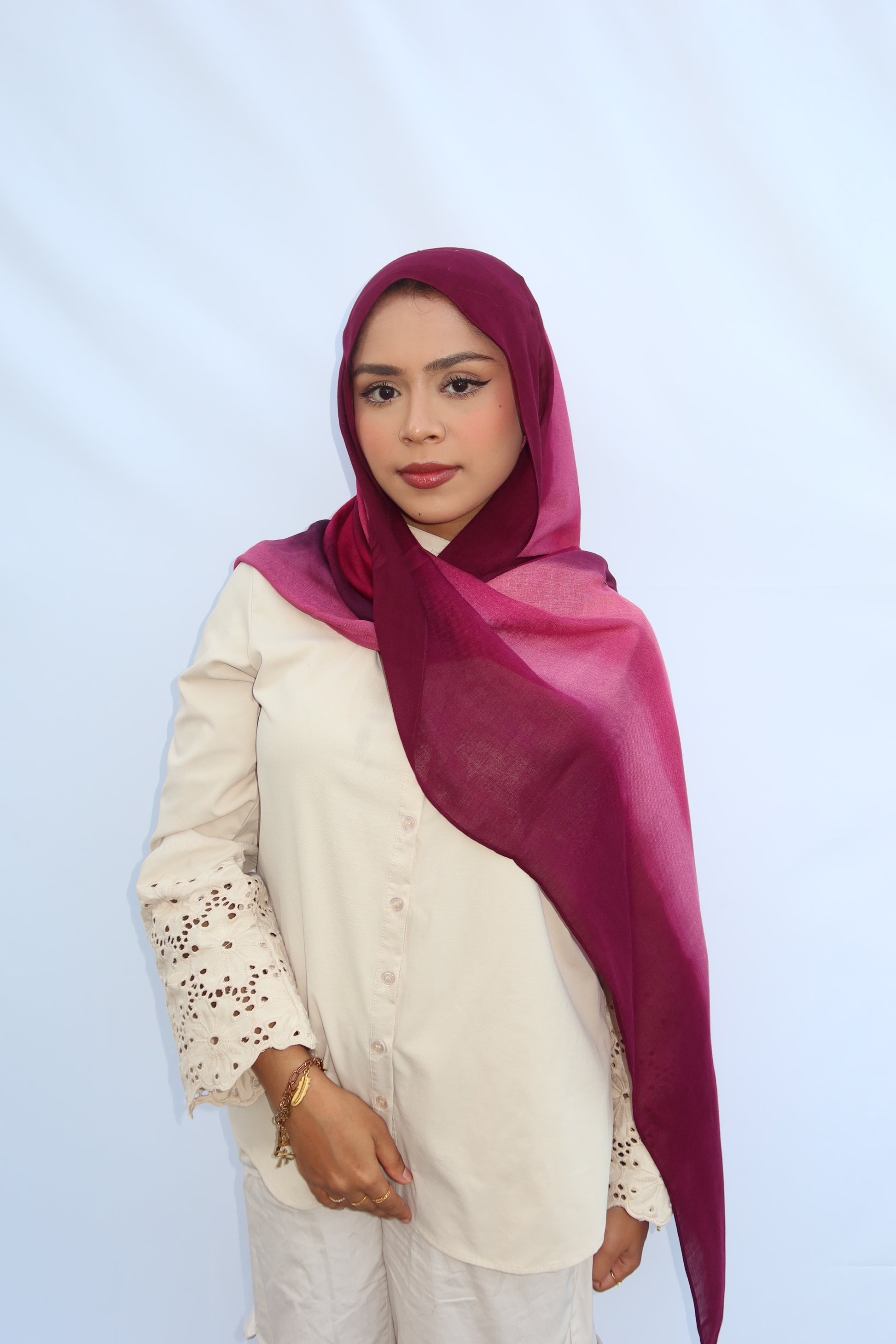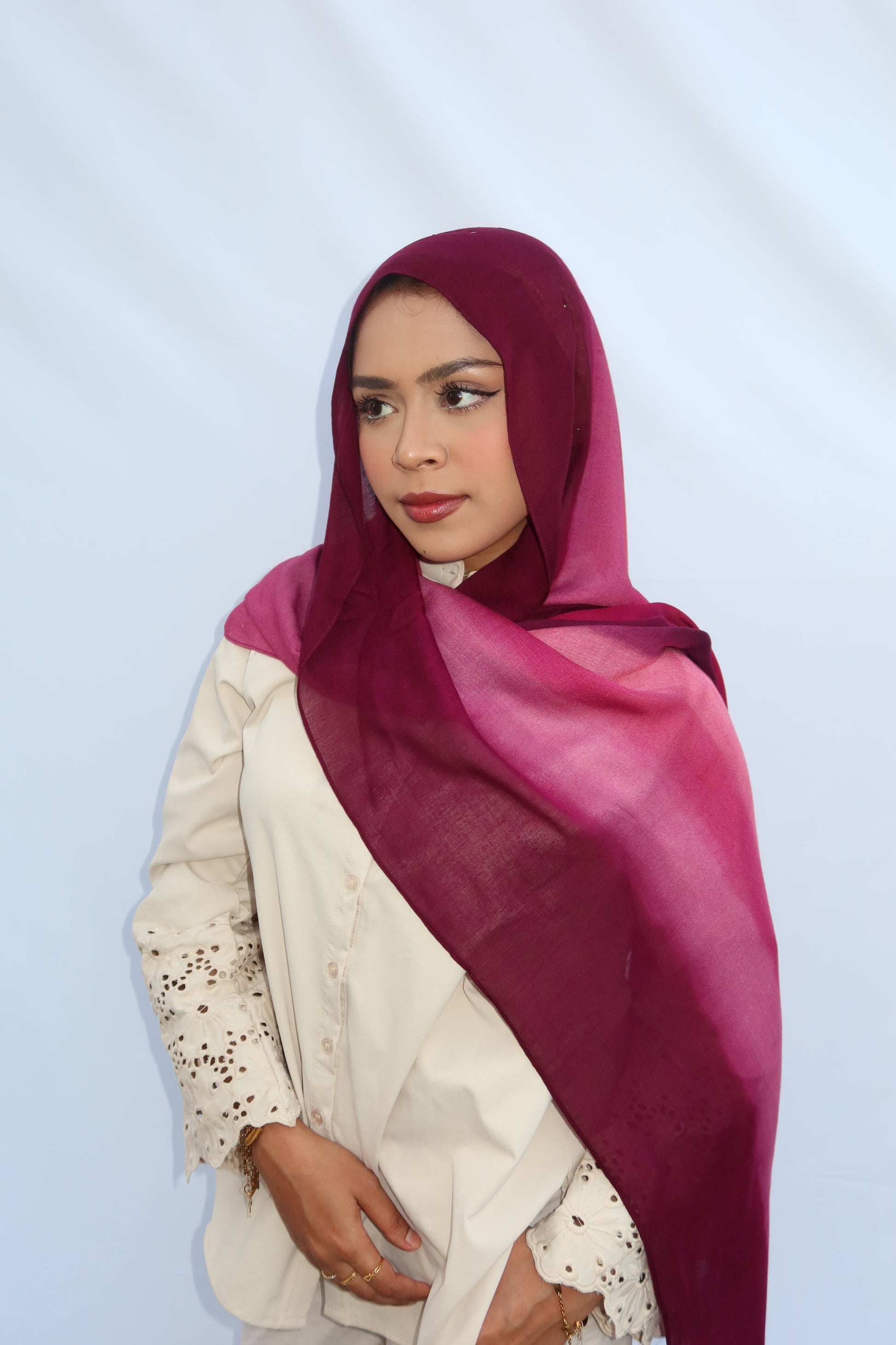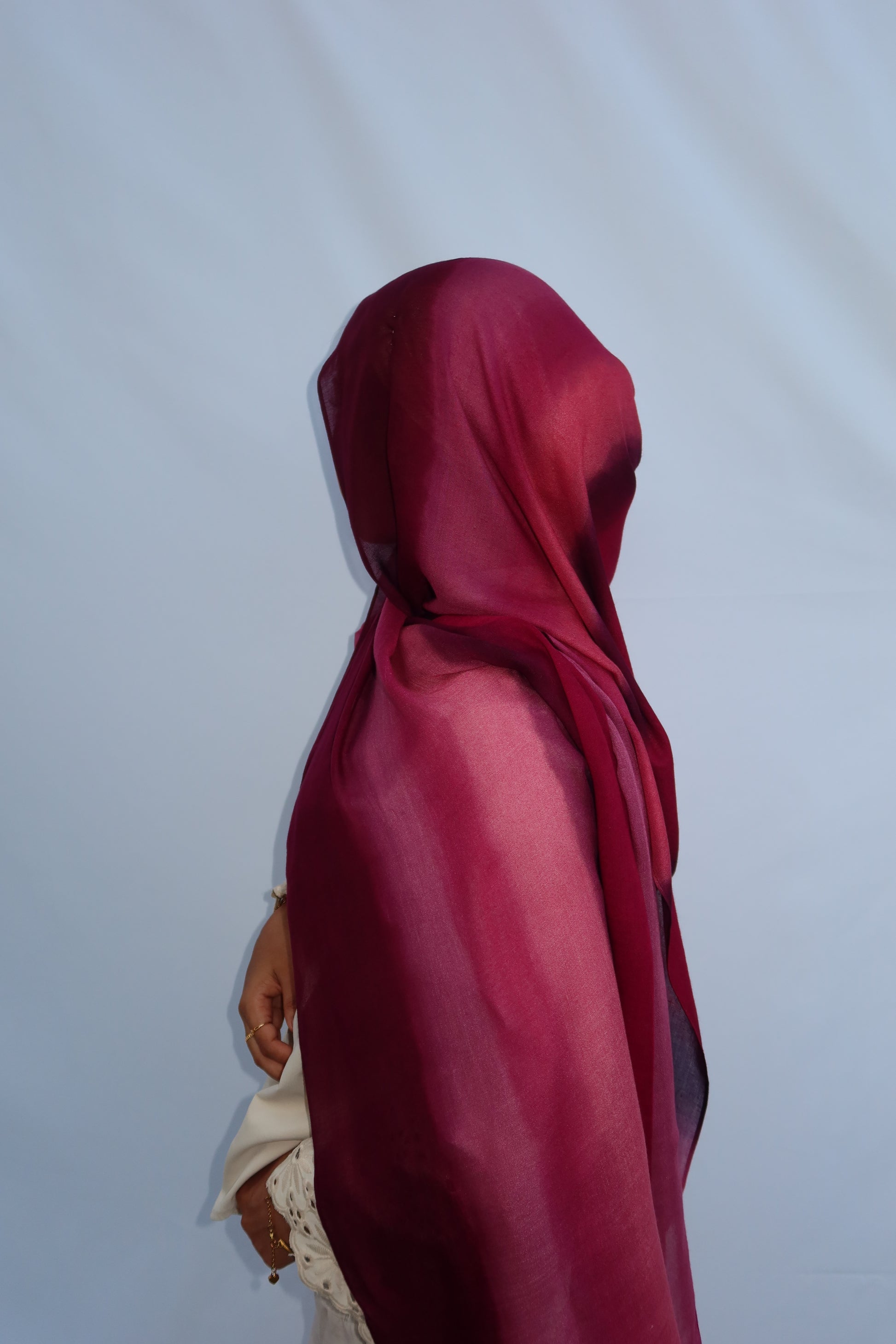 Berry Dusk: 🍓🍇🩷♥️ This Hijab Features A Soft Ombre Blend Of Deep Plum, Burgundy, Berry, And Pinkish Wine Tones That Flow Beautifully Together. The Gradient Shifts Seamlessly From Dark To Light, Giving It A Luxurious, Feminine Look. The Colors Blend In Together Beautifully And It’s The Prettiest Hijab Every Girl Needs!