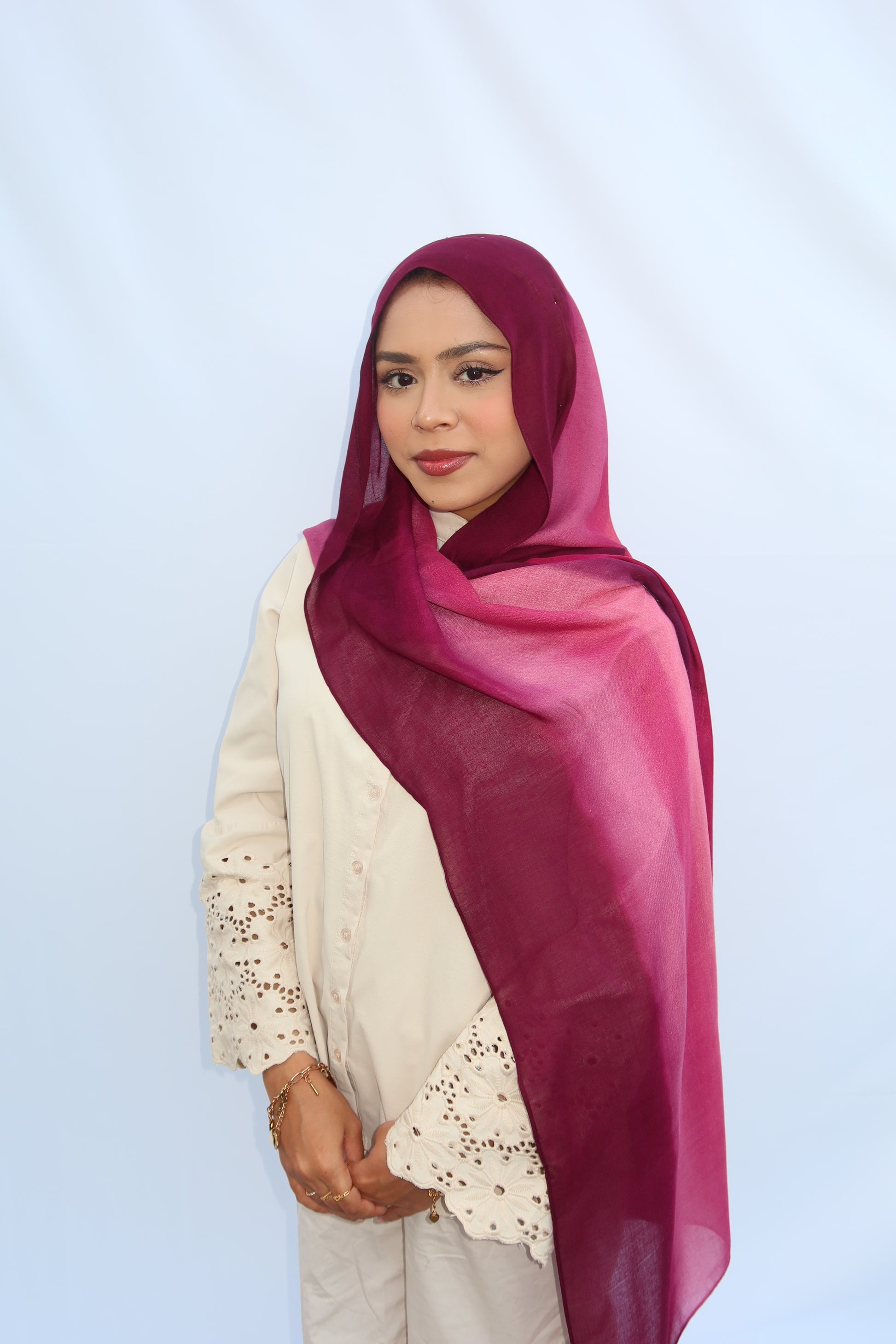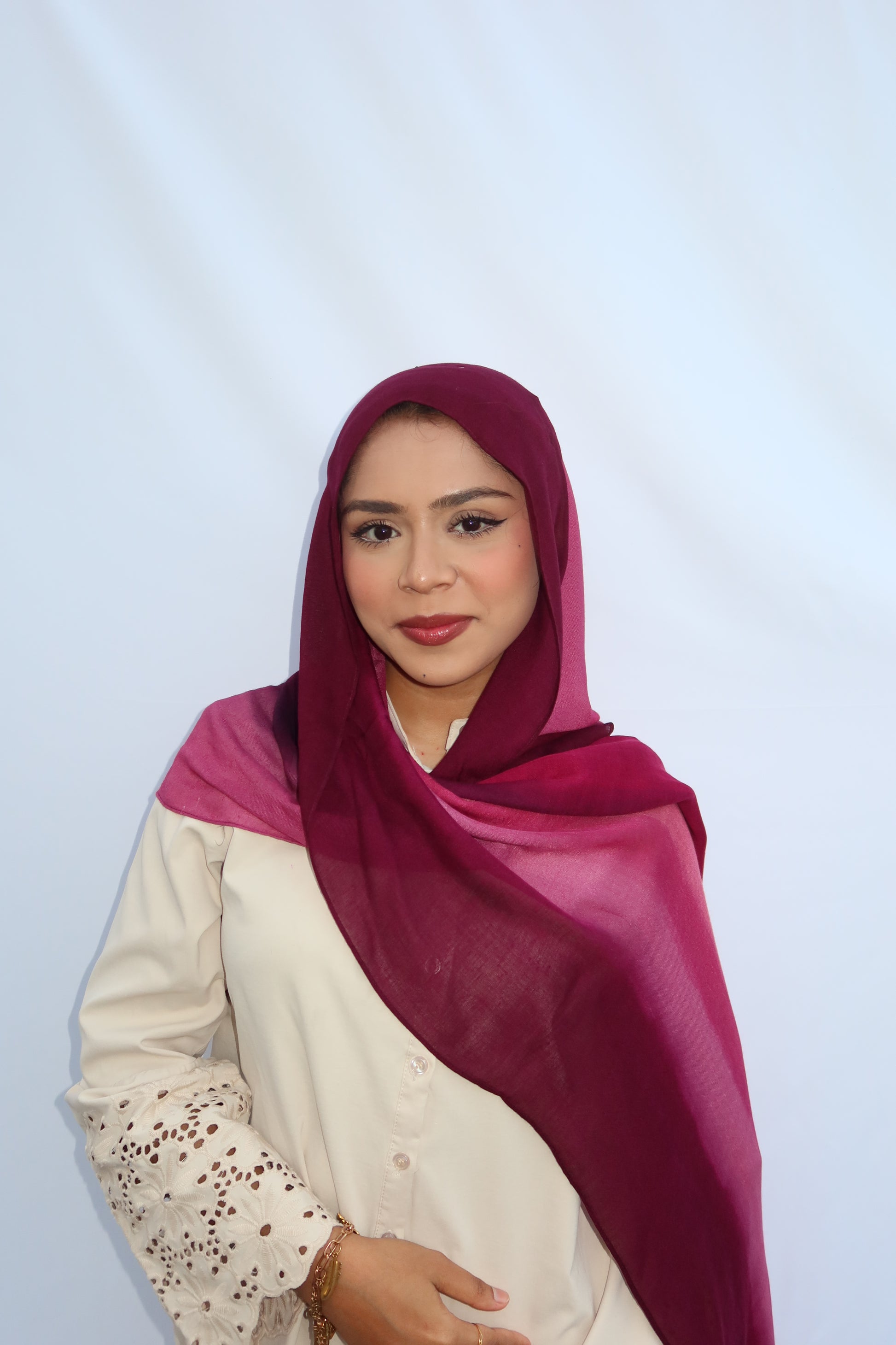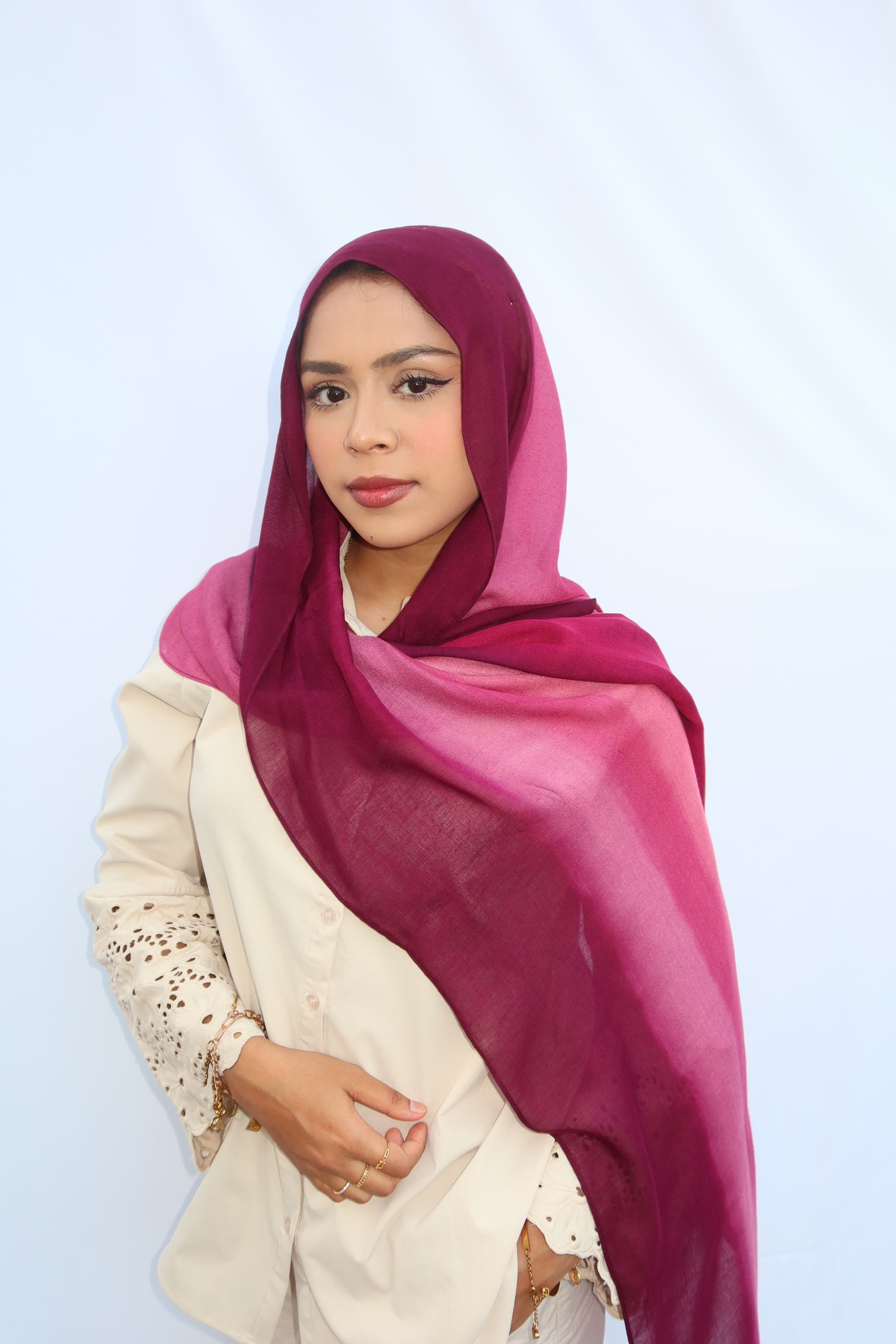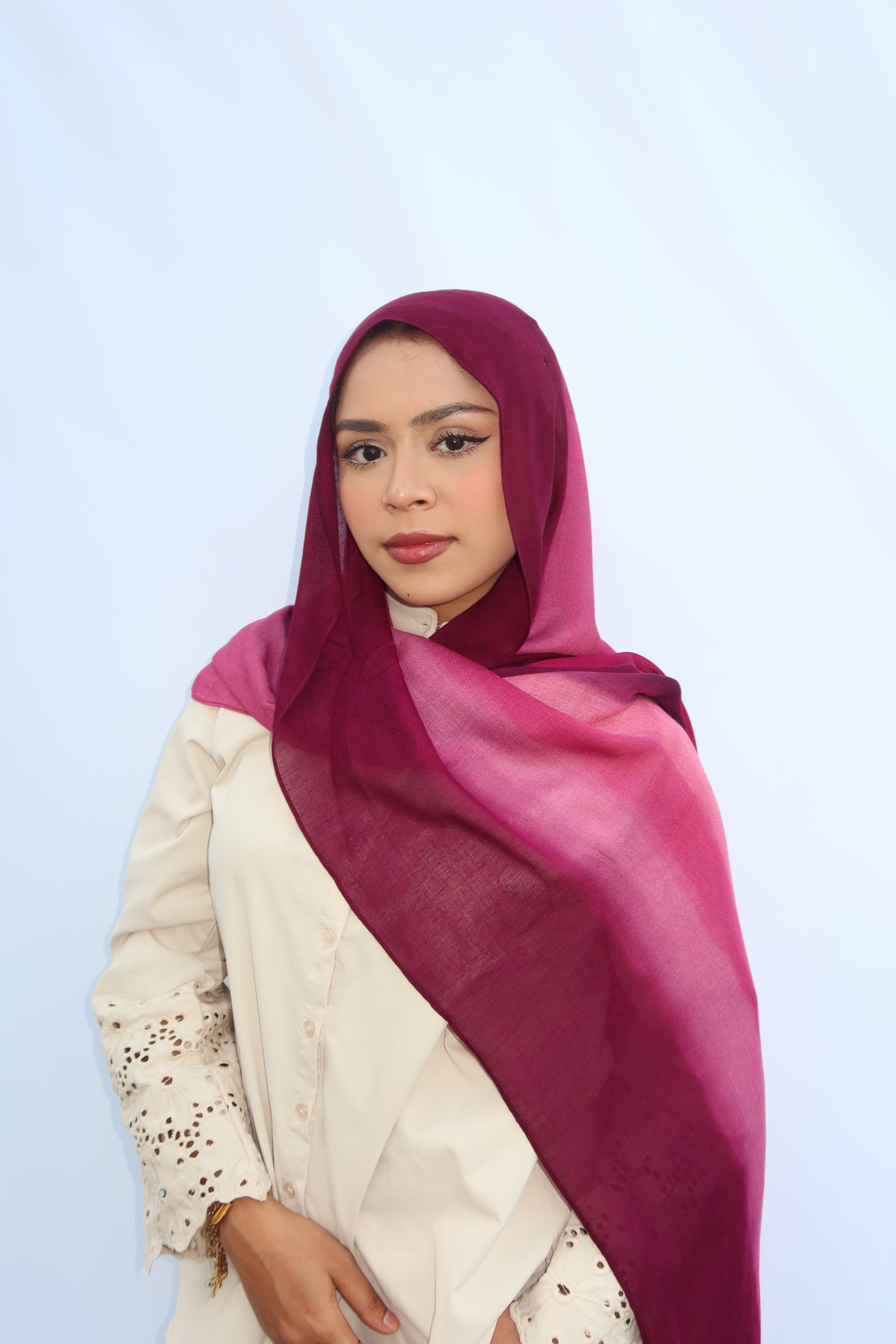 Berry Dusk: 🍓🍇🩷♥️ This Hijab Features A Soft Ombre Blend Of Deep Plum, Burgundy, Berry, And Pinkish Wine Tones That Flow Beautifully Together. The Gradient Shifts Seamlessly From Dark To Light, Giving It A Luxurious, Feminine Look. The Colors Blend In Together Beautifully And It’s The Prettiest Hijab Every Girl Needs!