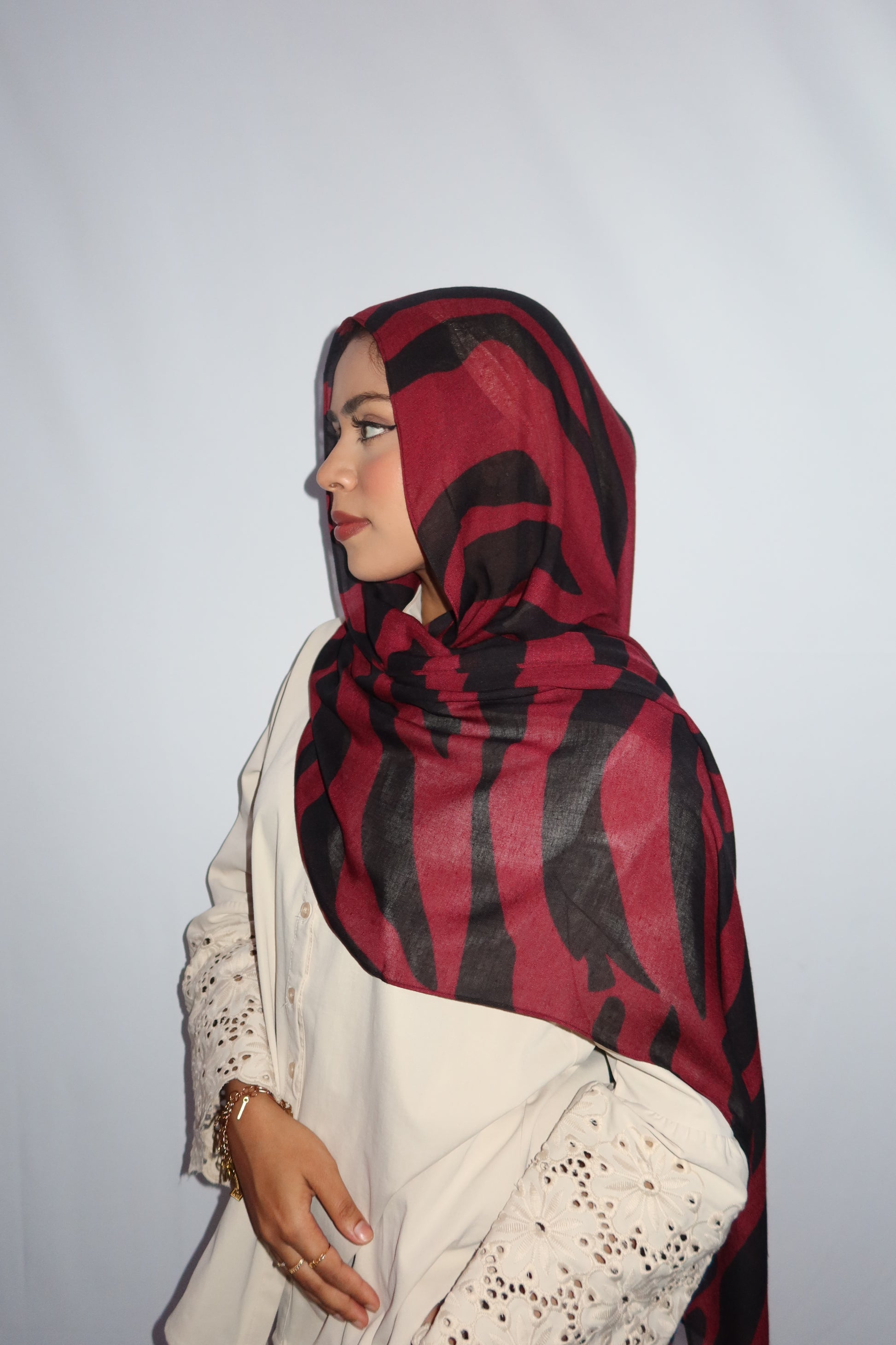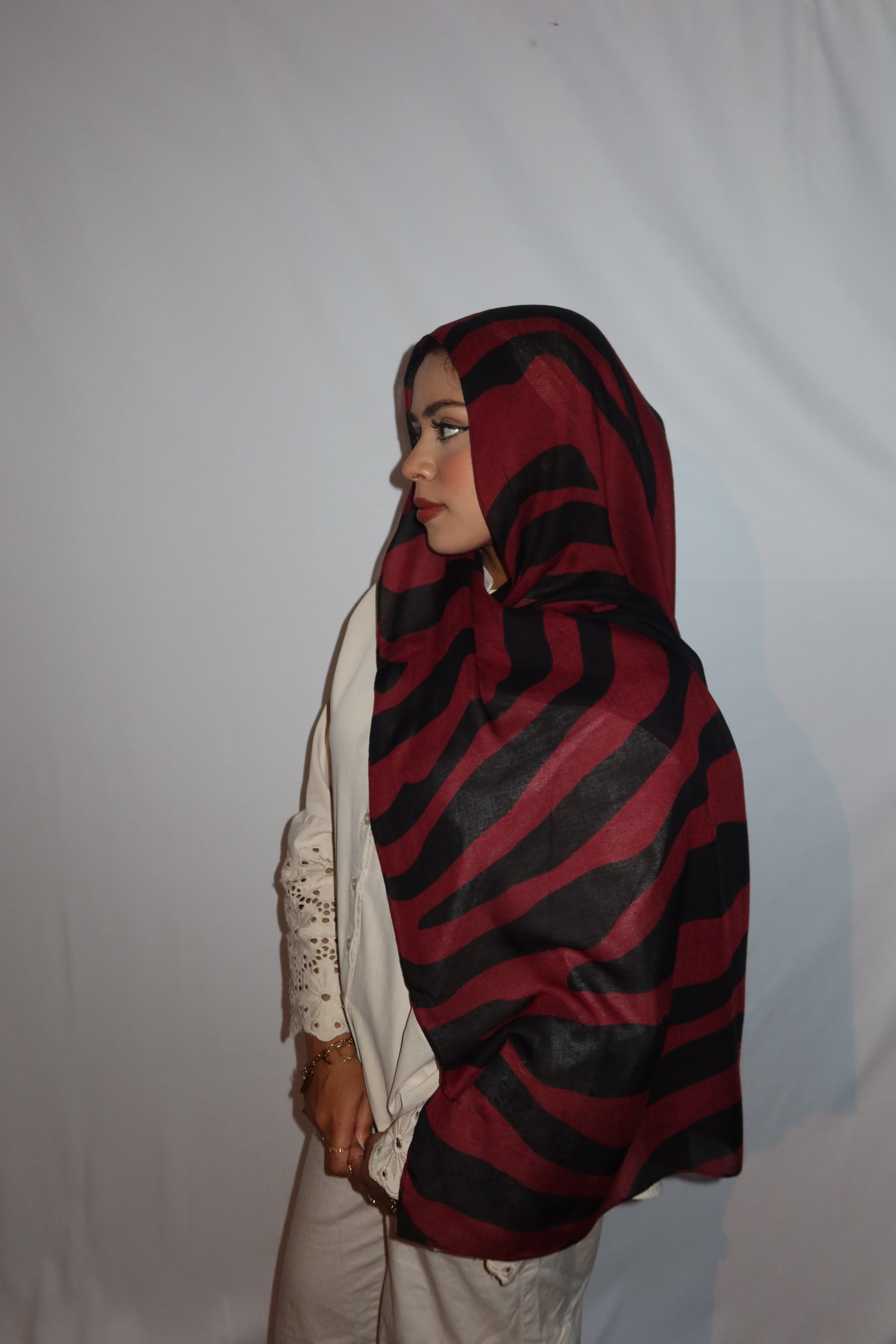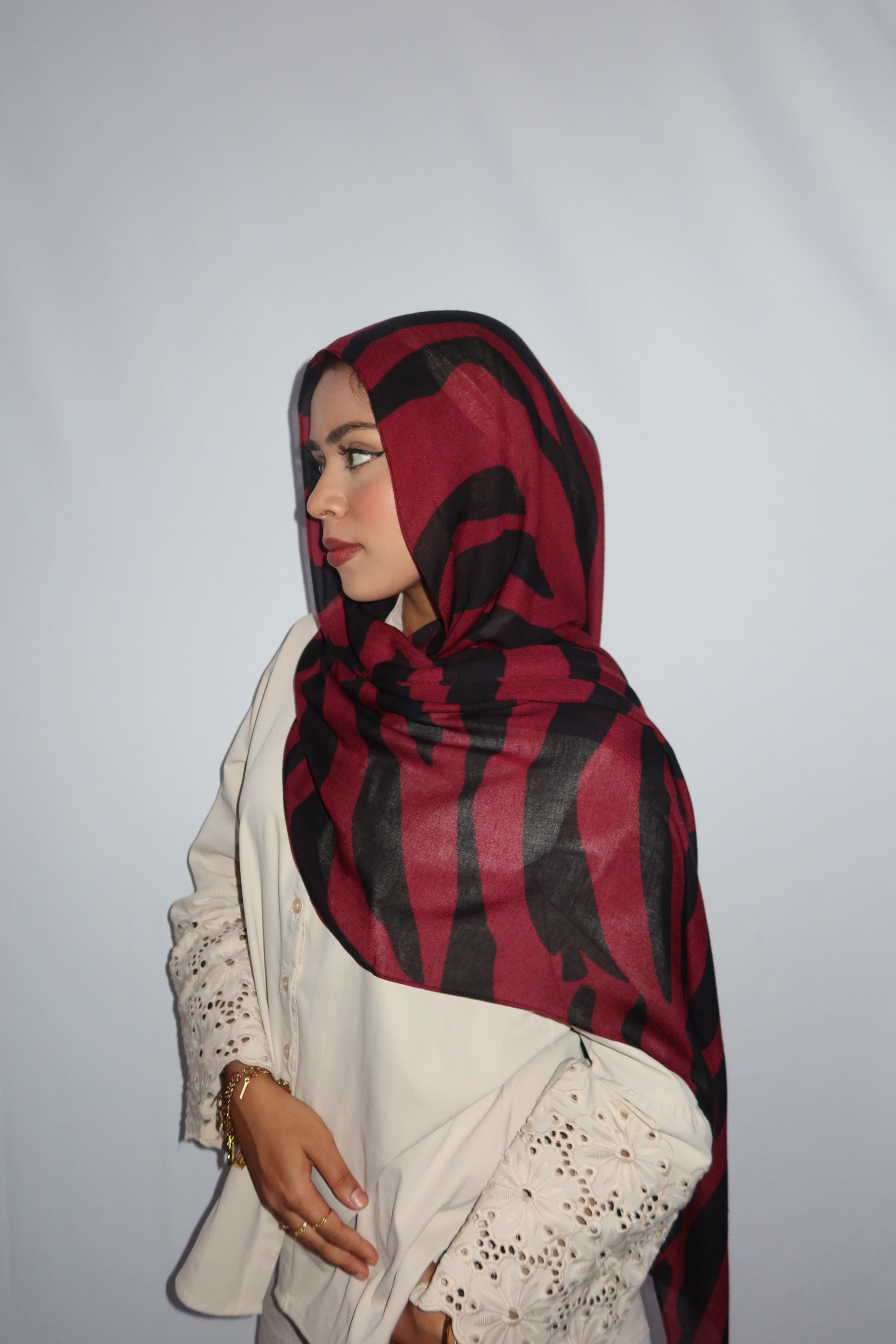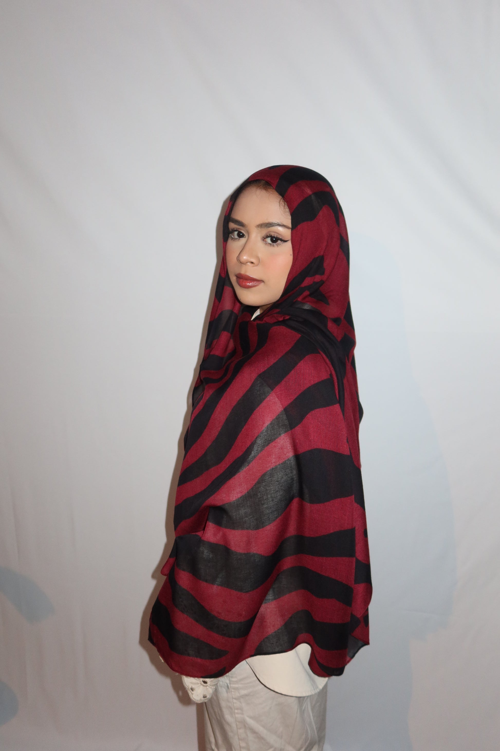 Maroon Paradise: ♥️🖤🌹🍇 This Hijab Features A Rich Burgundy Maroon Base With Deep Black Abstract Stripes Flowing Through The Hijab. The Unique Pattern Adds A Touch Of Sophistication While Keeping It Modern And Effortlessly Stylish. This Print Is Absolutely Gorgeous And A Must Have!