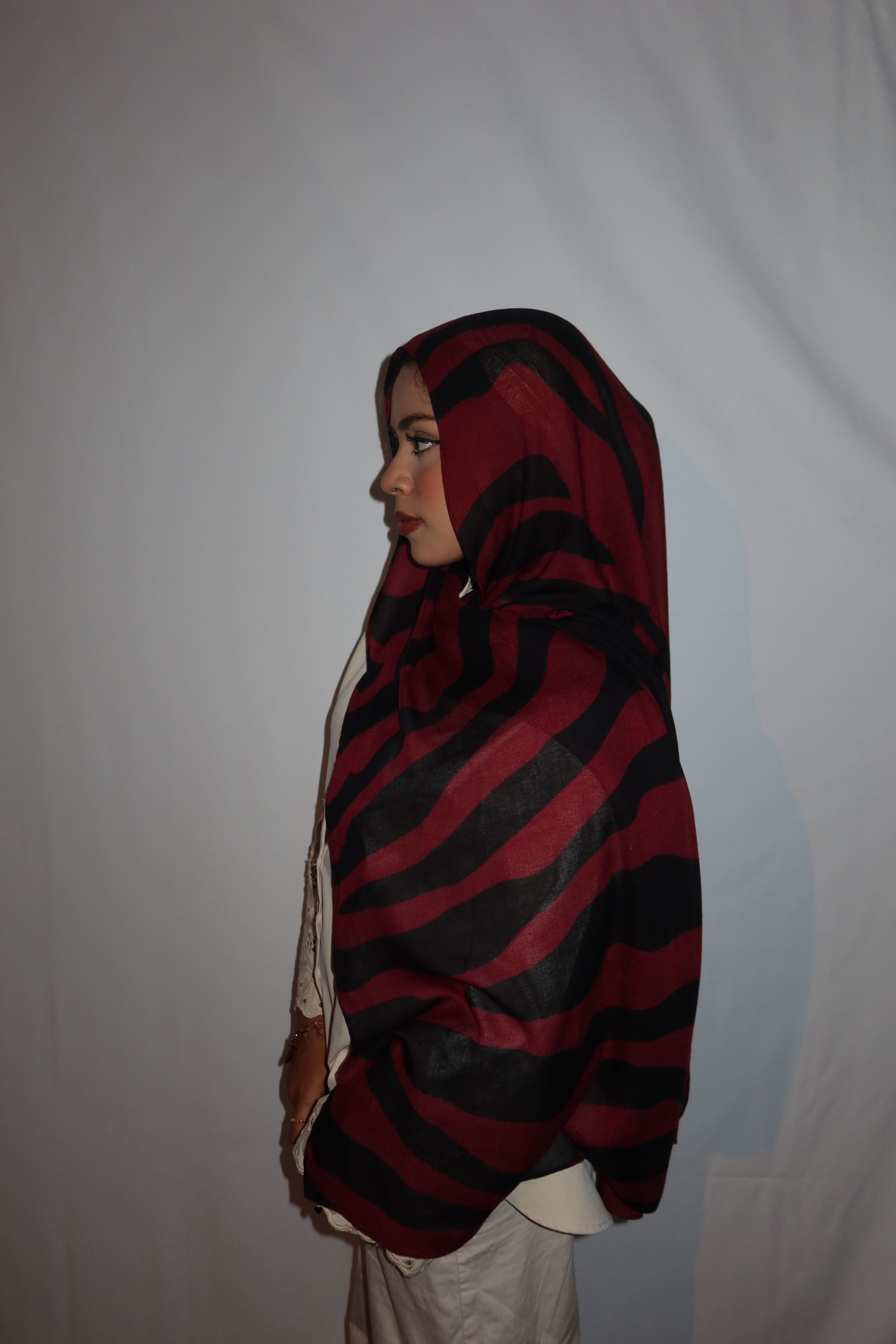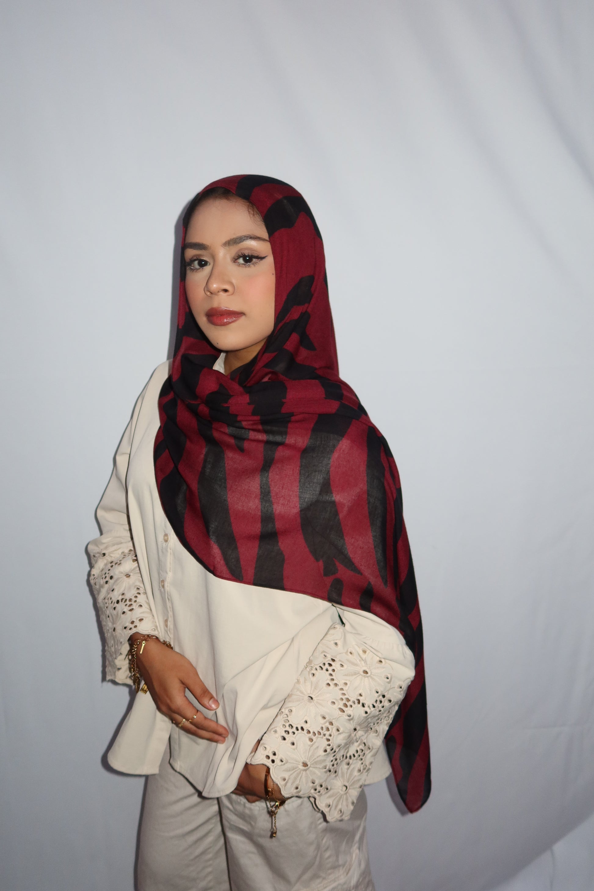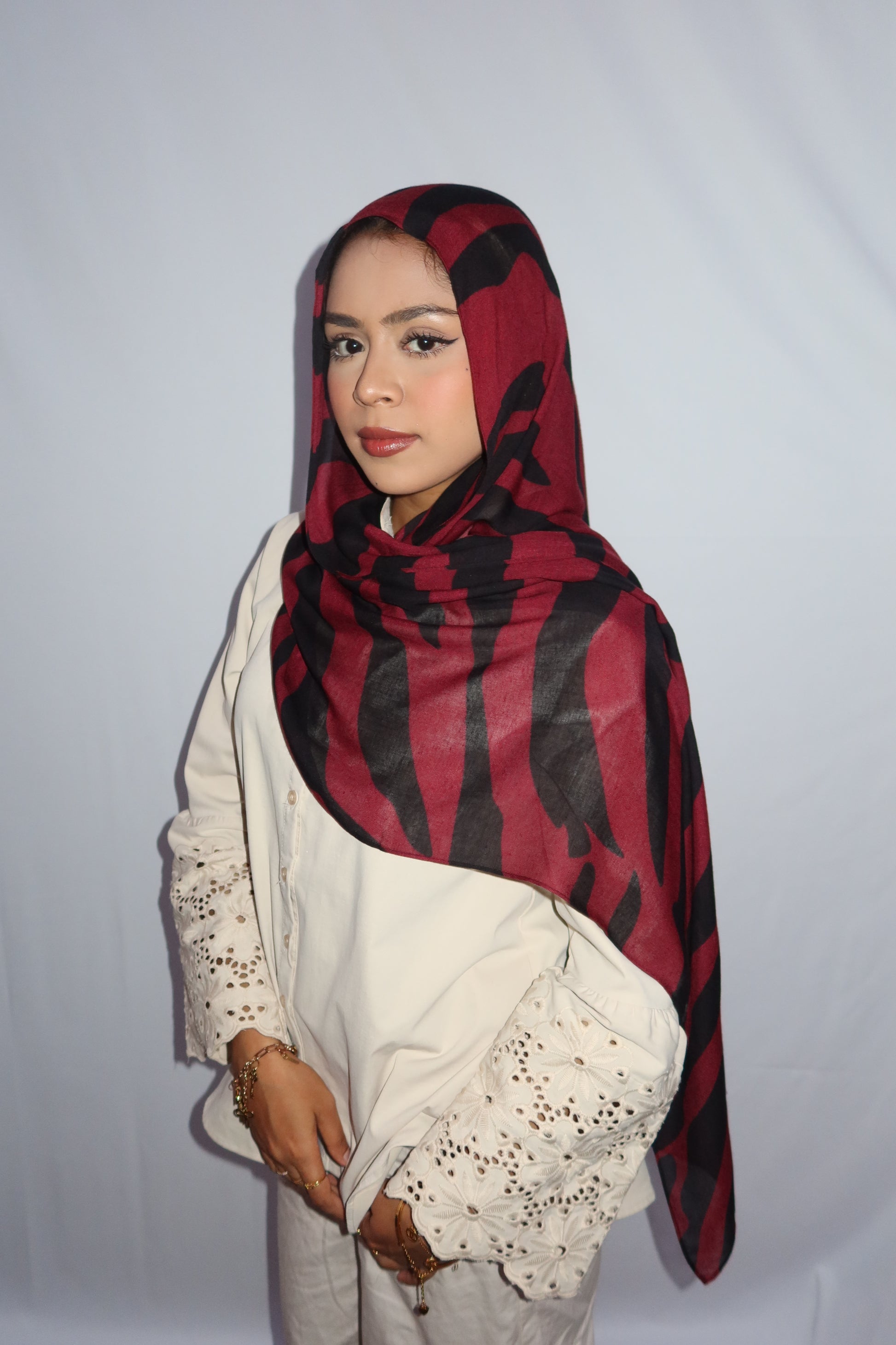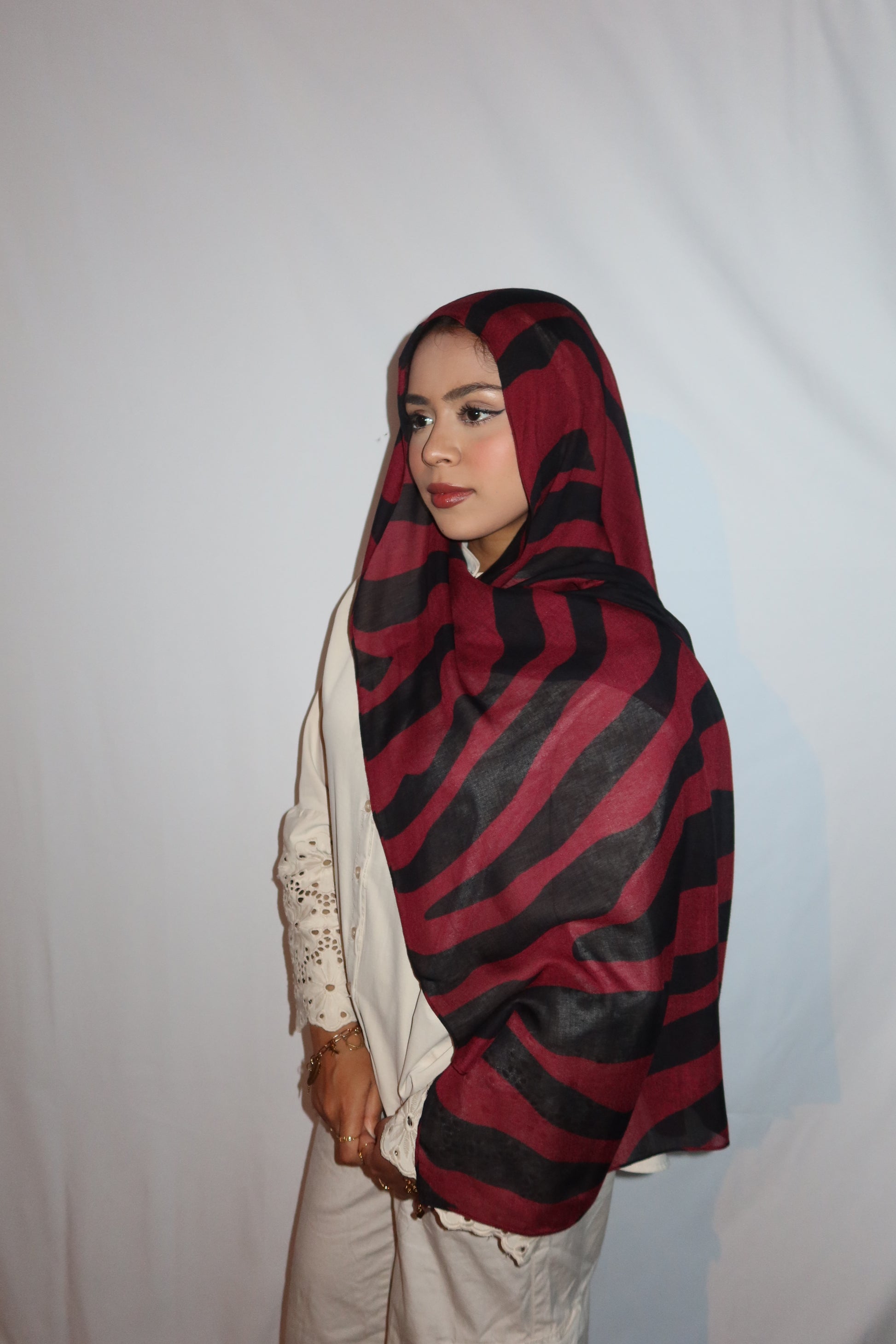 Maroon Paradise: ♥️🖤🌹🍇 This Hijab Features A Rich Burgundy Maroon Base With Deep Black Abstract Stripes Flowing Through The Hijab. The Unique Pattern Adds A Touch Of Sophistication While Keeping It Modern And Effortlessly Stylish. This Print Is Absolutely Gorgeous And A Must Have!