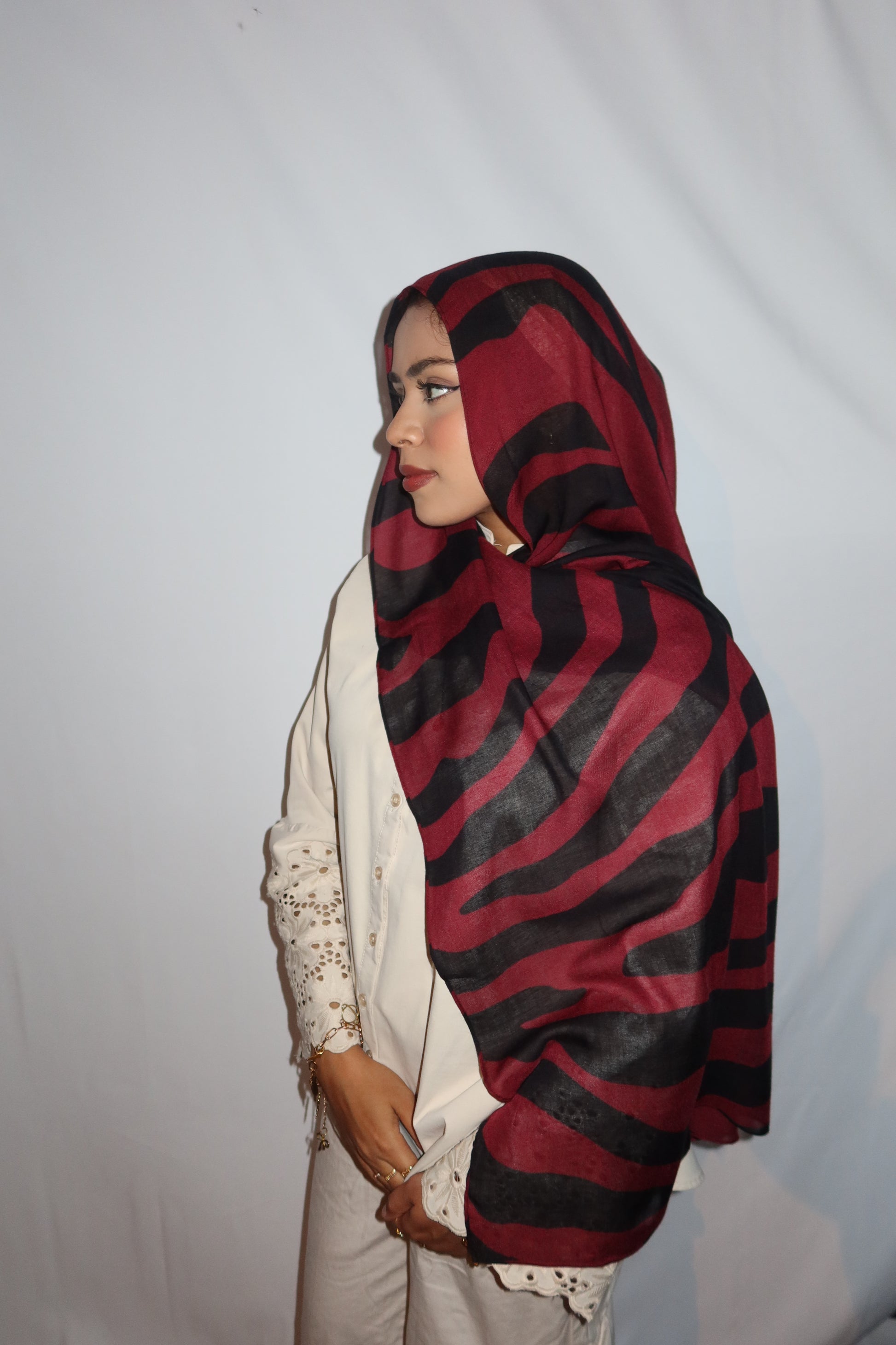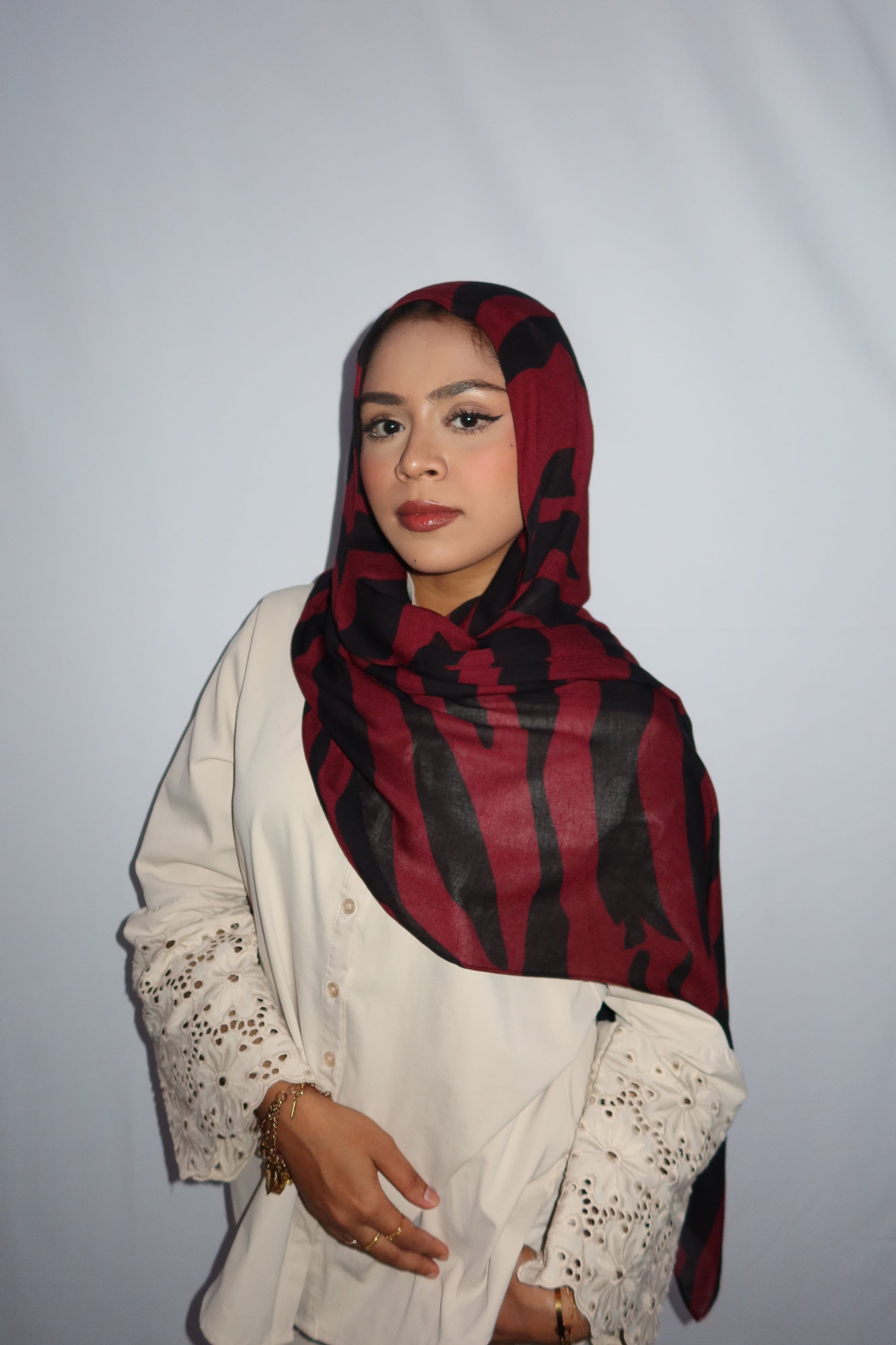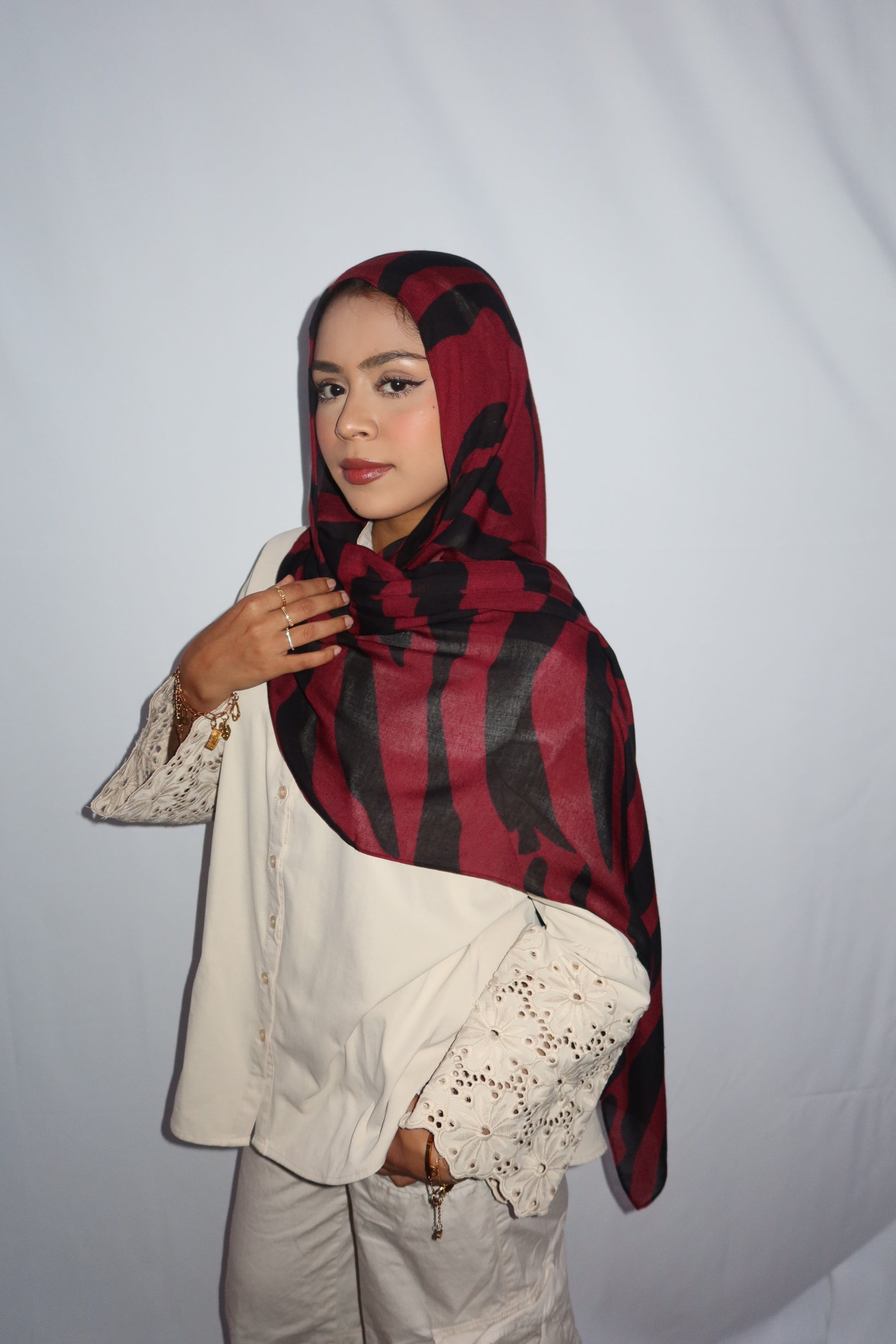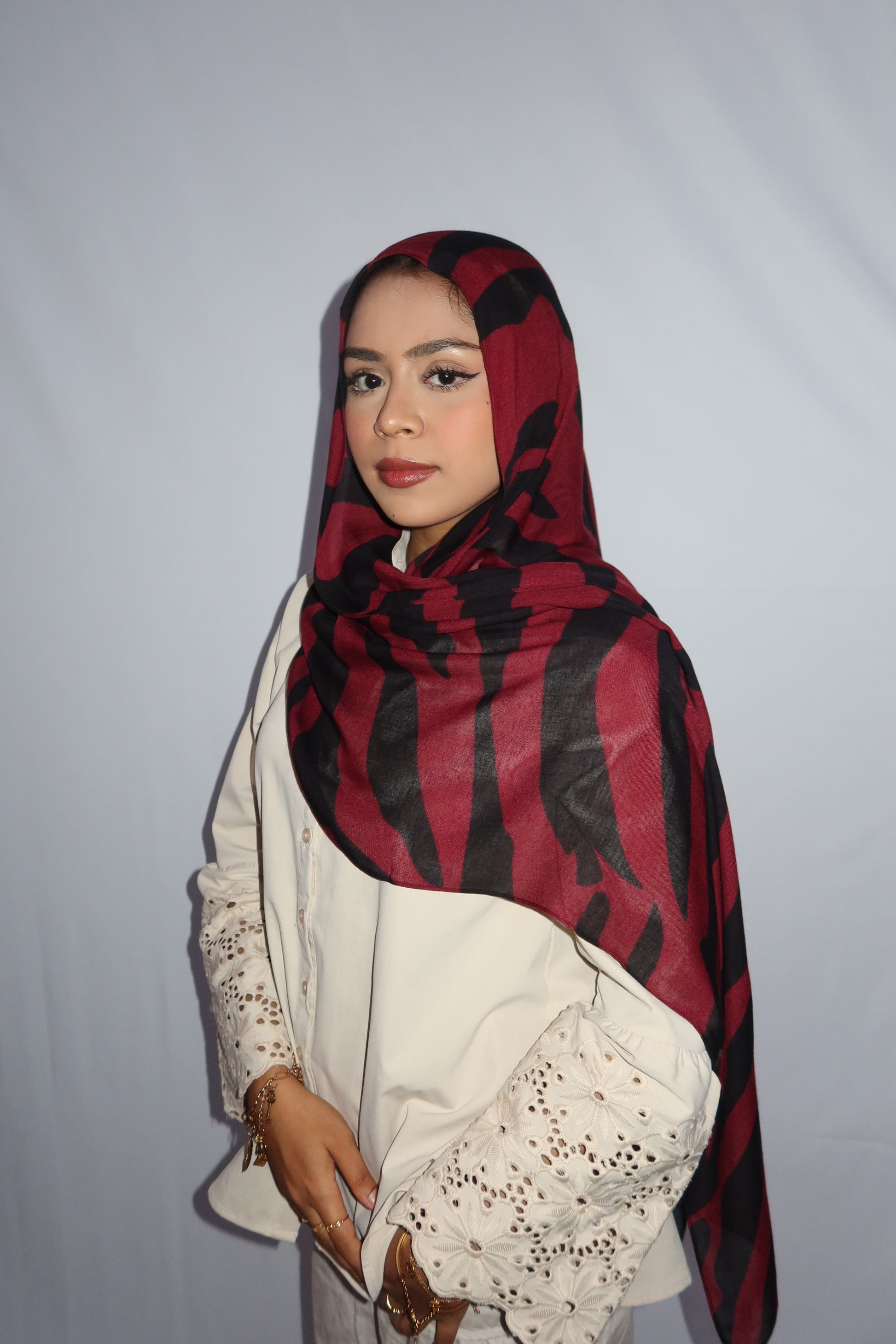 Maroon Paradise: ♥️🖤🌹🍇 This Hijab Features A Rich Burgundy Maroon Base With Deep Black Abstract Stripes Flowing Through The Hijab. The Unique Pattern Adds A Touch Of Sophistication While Keeping It Modern And Effortlessly Stylish. This Print Is Absolutely Gorgeous And A Must Have!