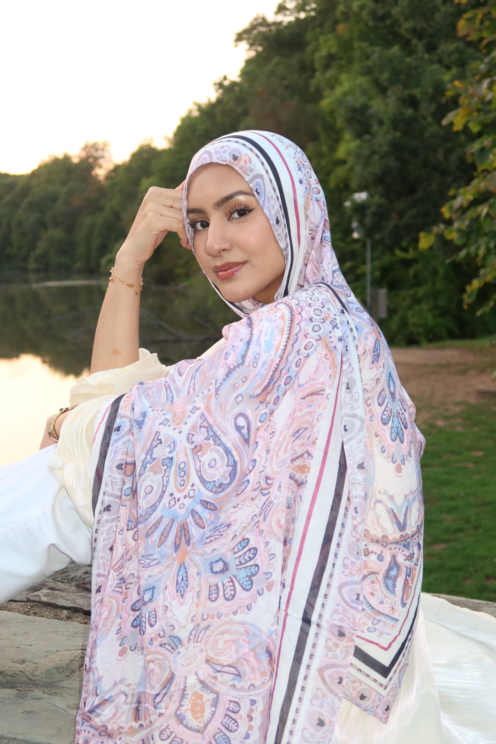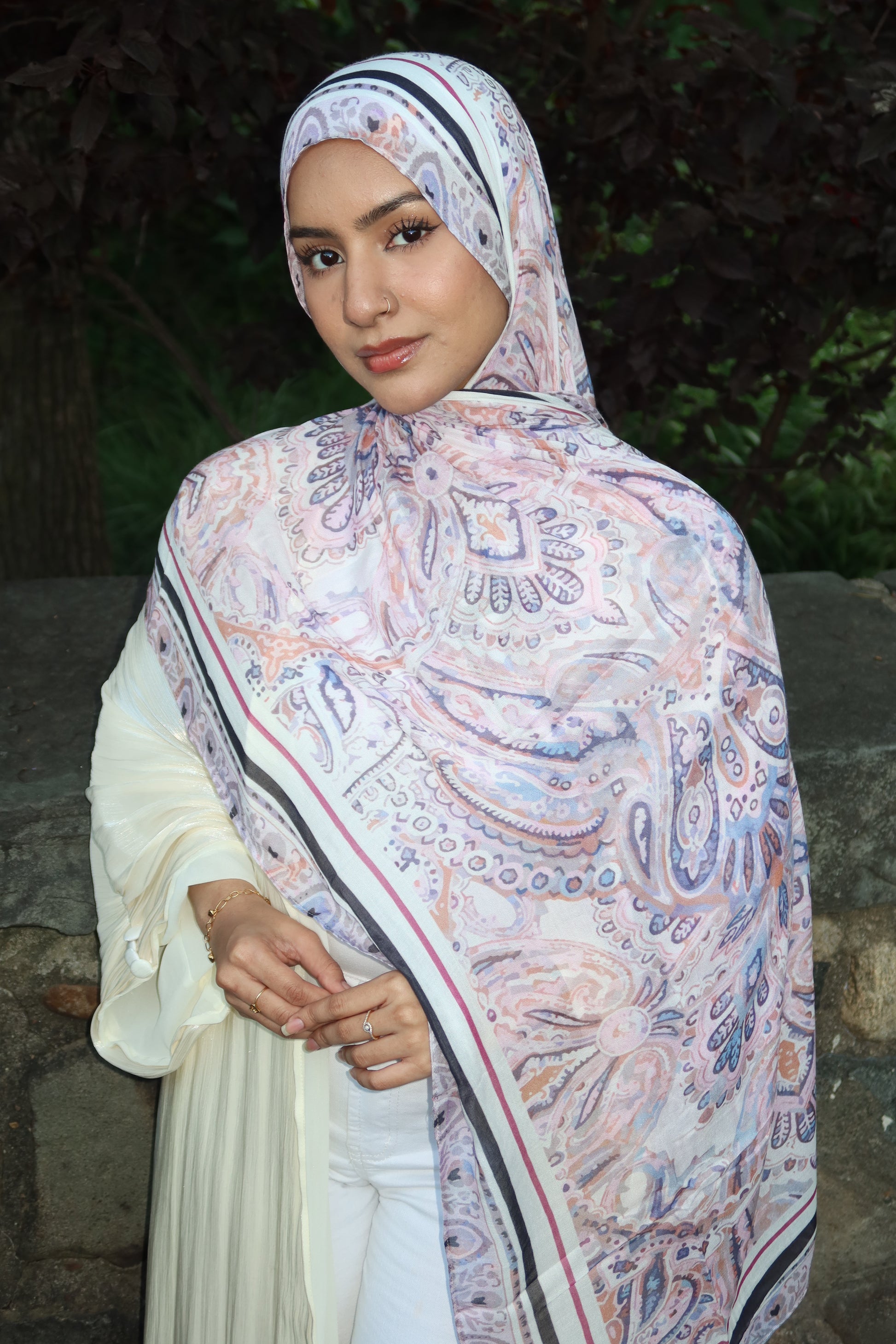Lavender Rose Pashmina: 💜🌸✨ This Hijab Is Absolutely Stunning With A Gorgeous Pashmina-Inspired Print. It Features Pastel Shades Of Lavender, Rose Pink, Coral, And Soft Purple Tones Blended Together To Create A Dreamy And Elegant Look. The Abstract Design And Flowing Colors Give It A Pashmina-Inspired Touch, Making It A Must-Have Statement Piece For Every Girl.