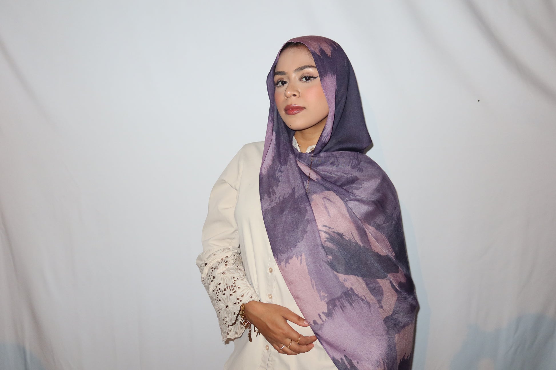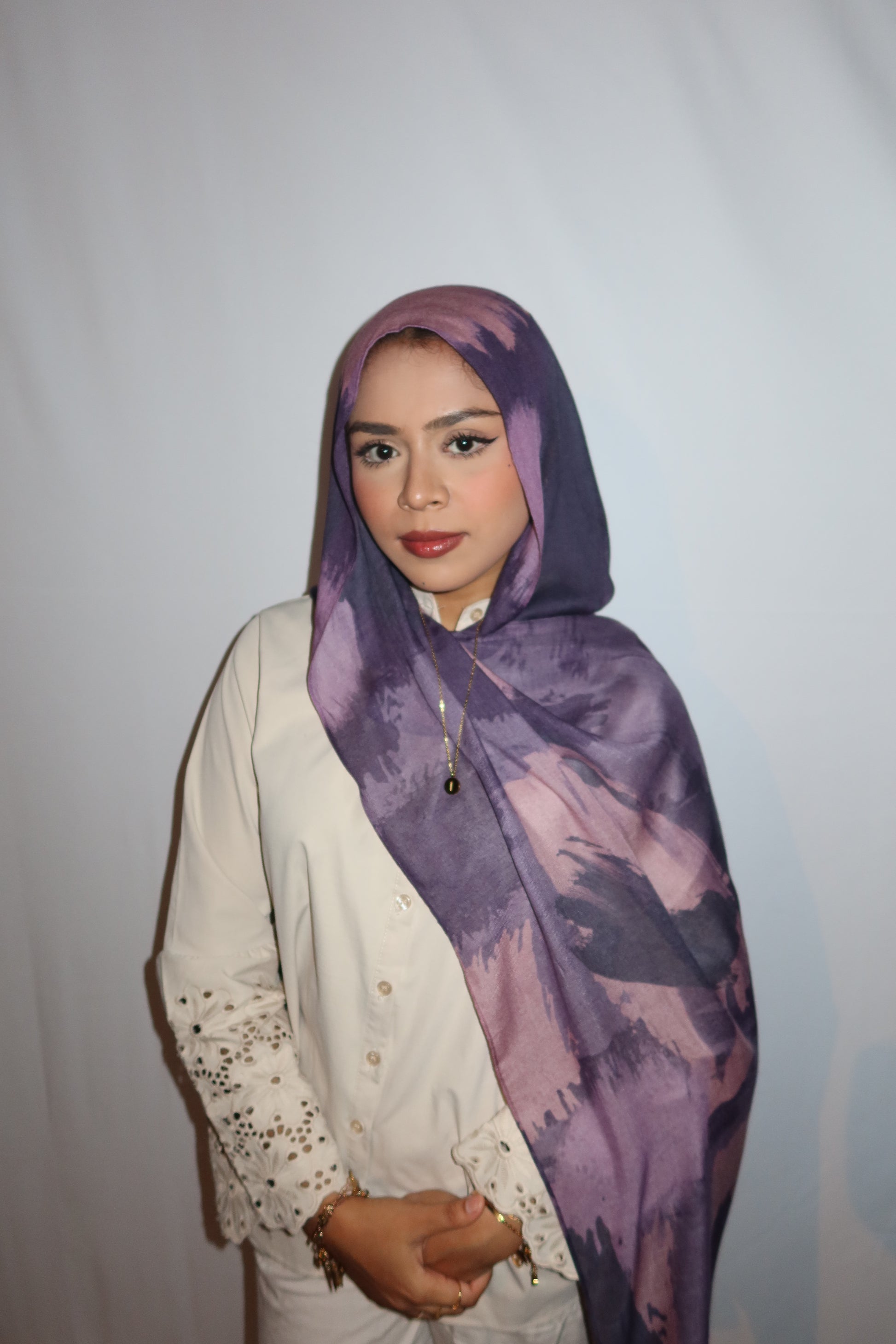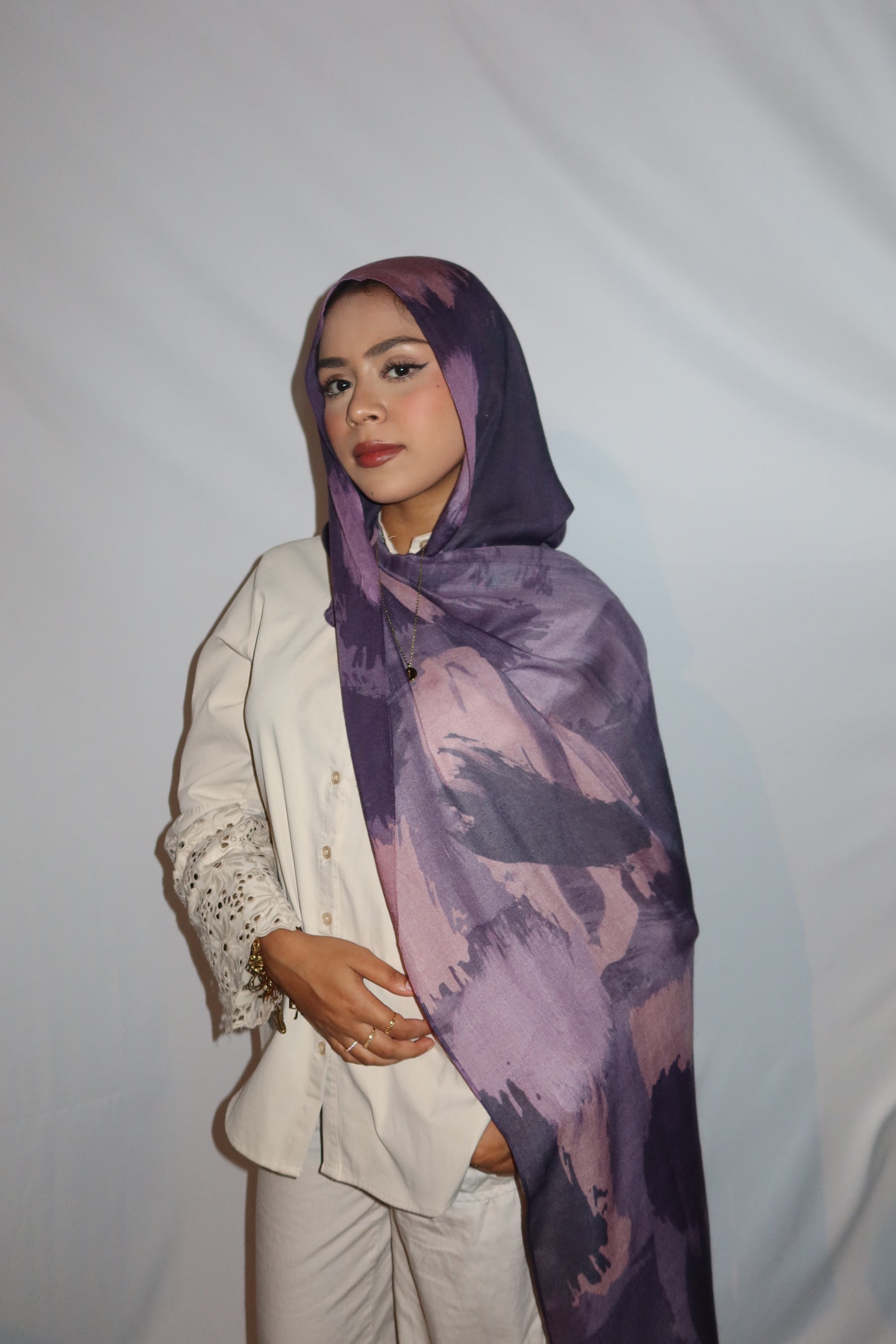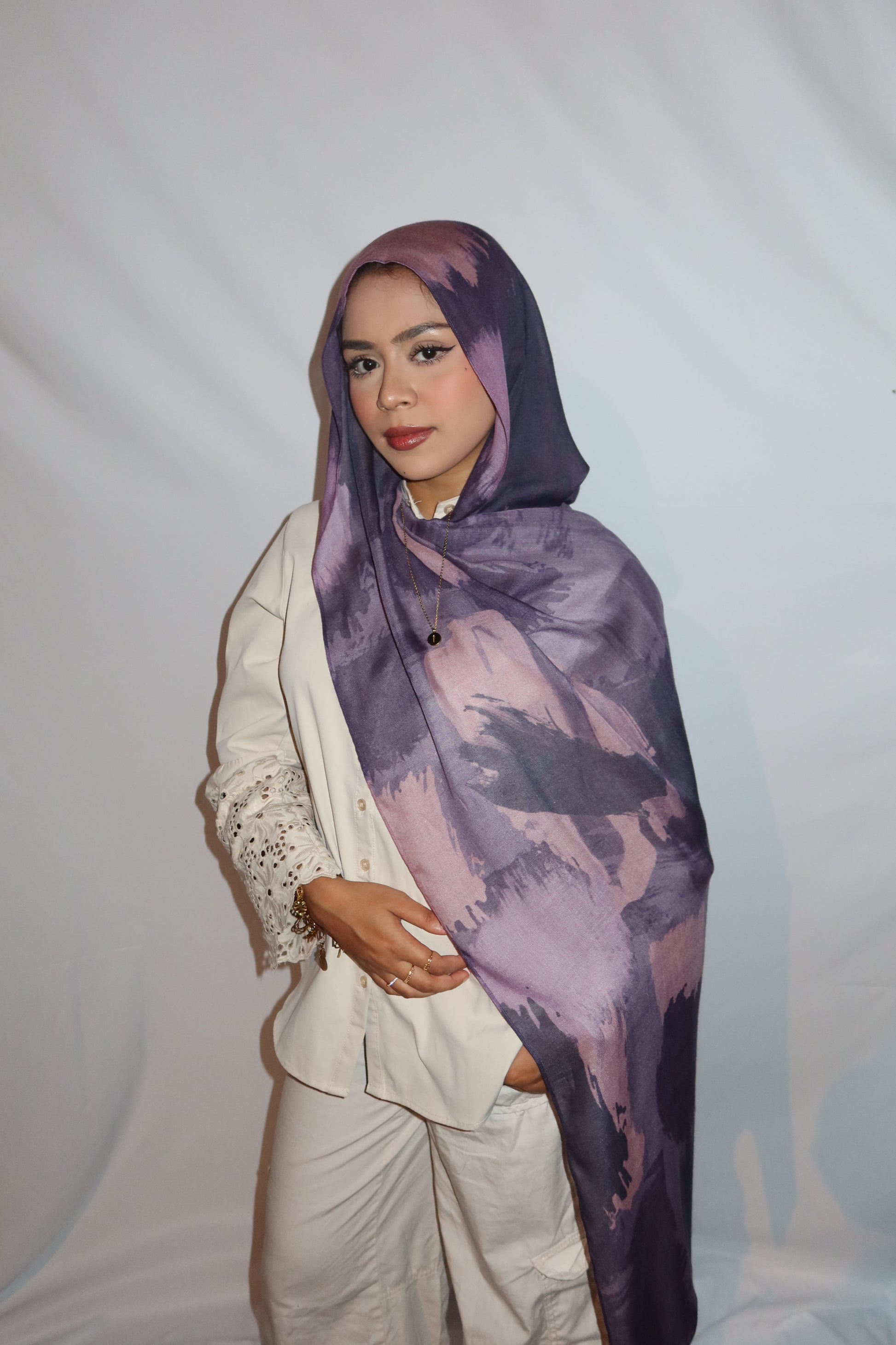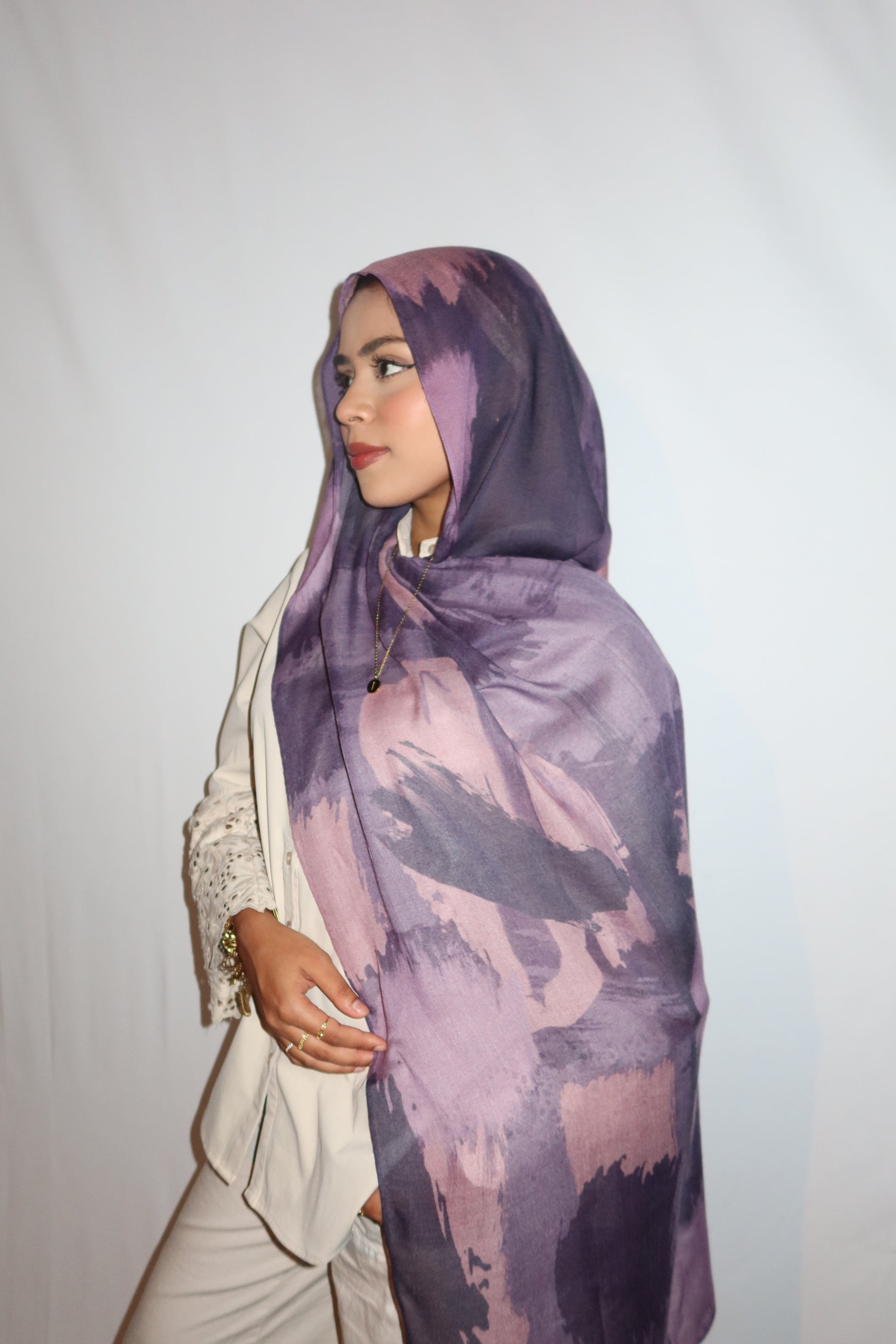 Amethyst Whisper: 💜💗🌸 This Hijab Features A Gorgeous Blend Of Soft Purple, Lavender, Blush Pink And Deep Violet Tones That Flow Beautifully. The Abstract Watercolor Design Adds A Touch Of Elegance To Any Look. This Hijab Print Is Absolutely Gorgeous And A Must Have!