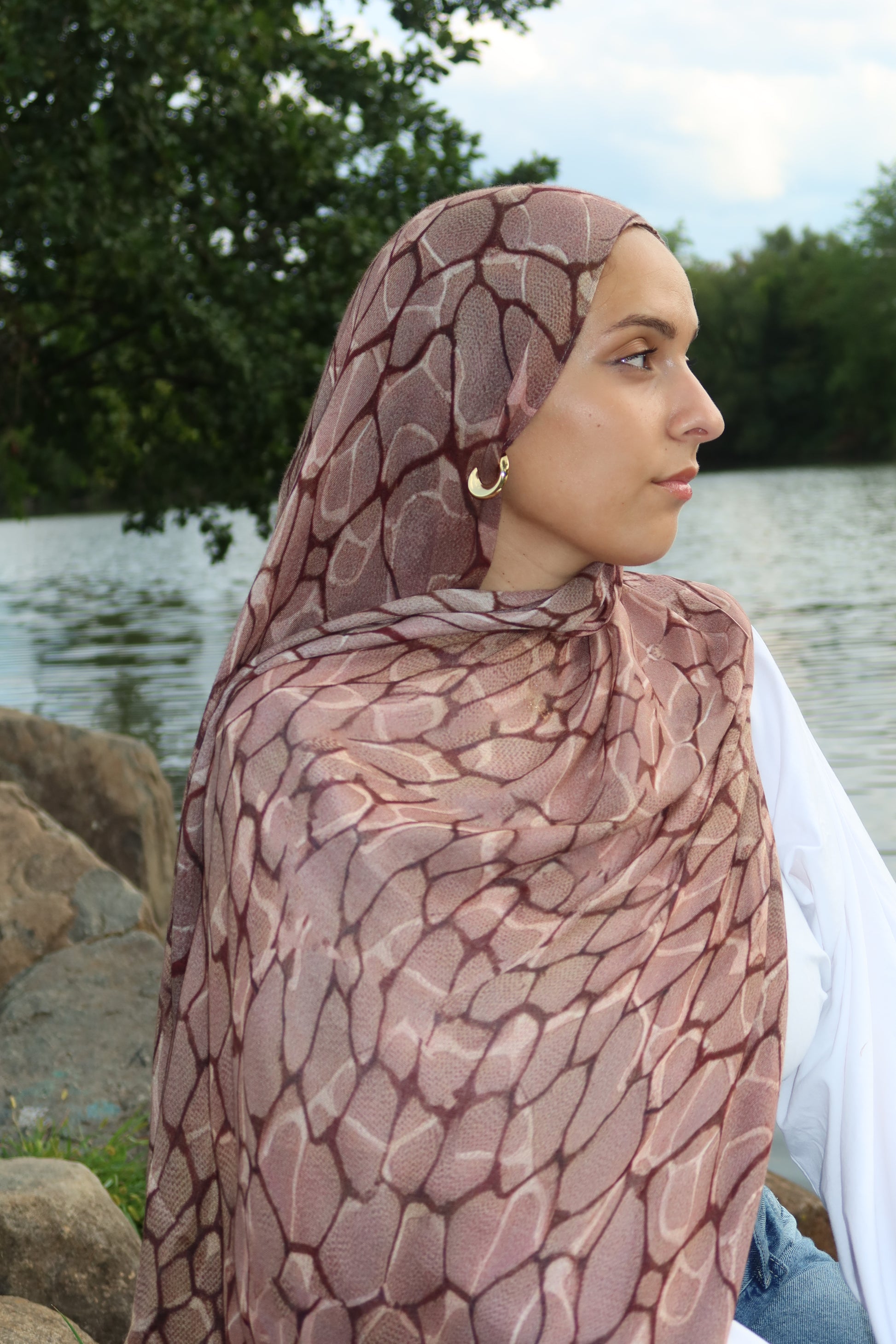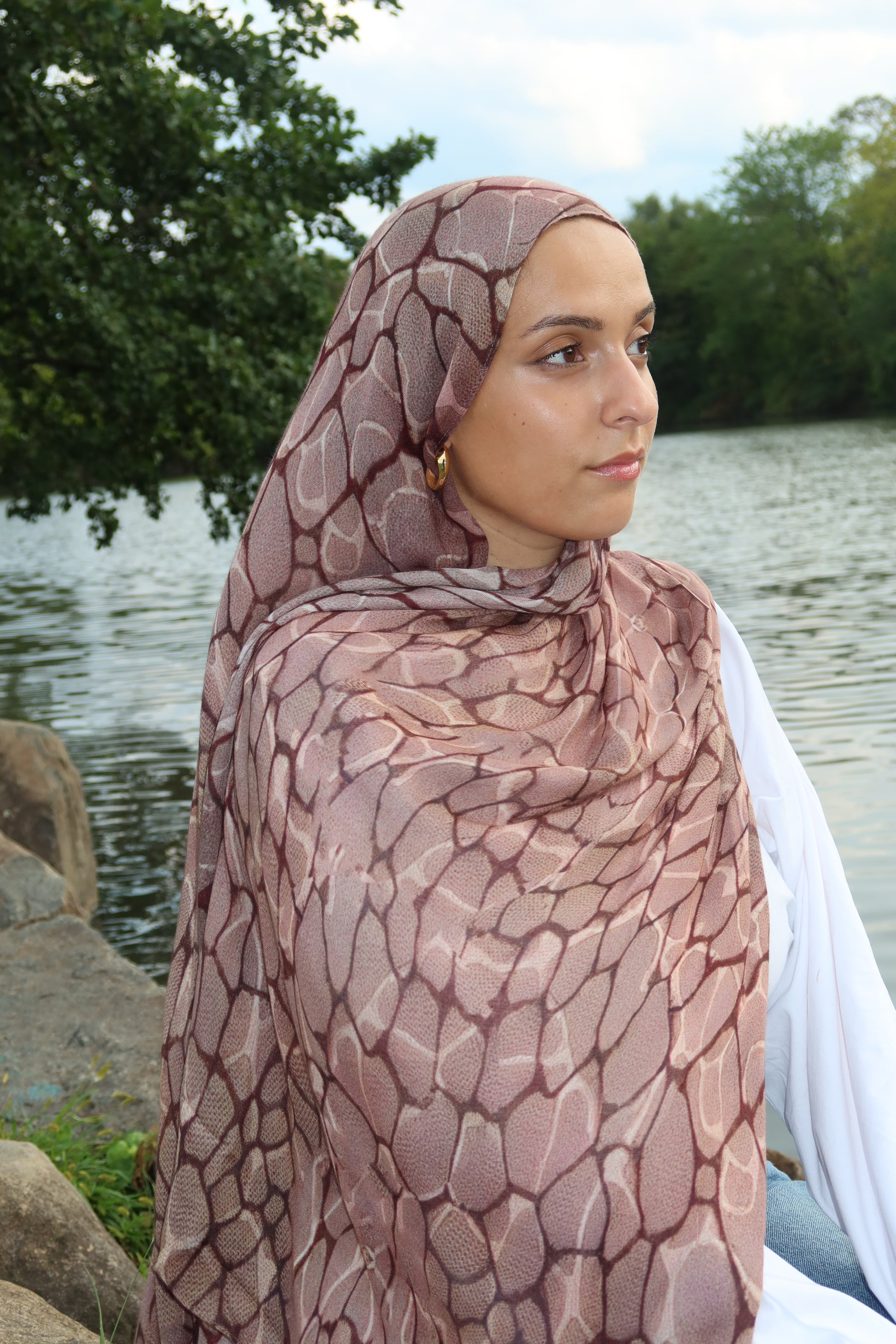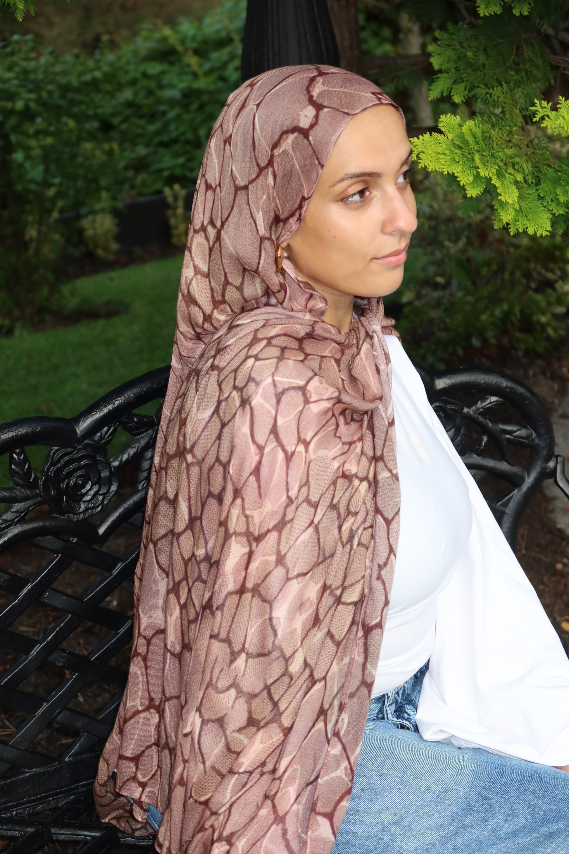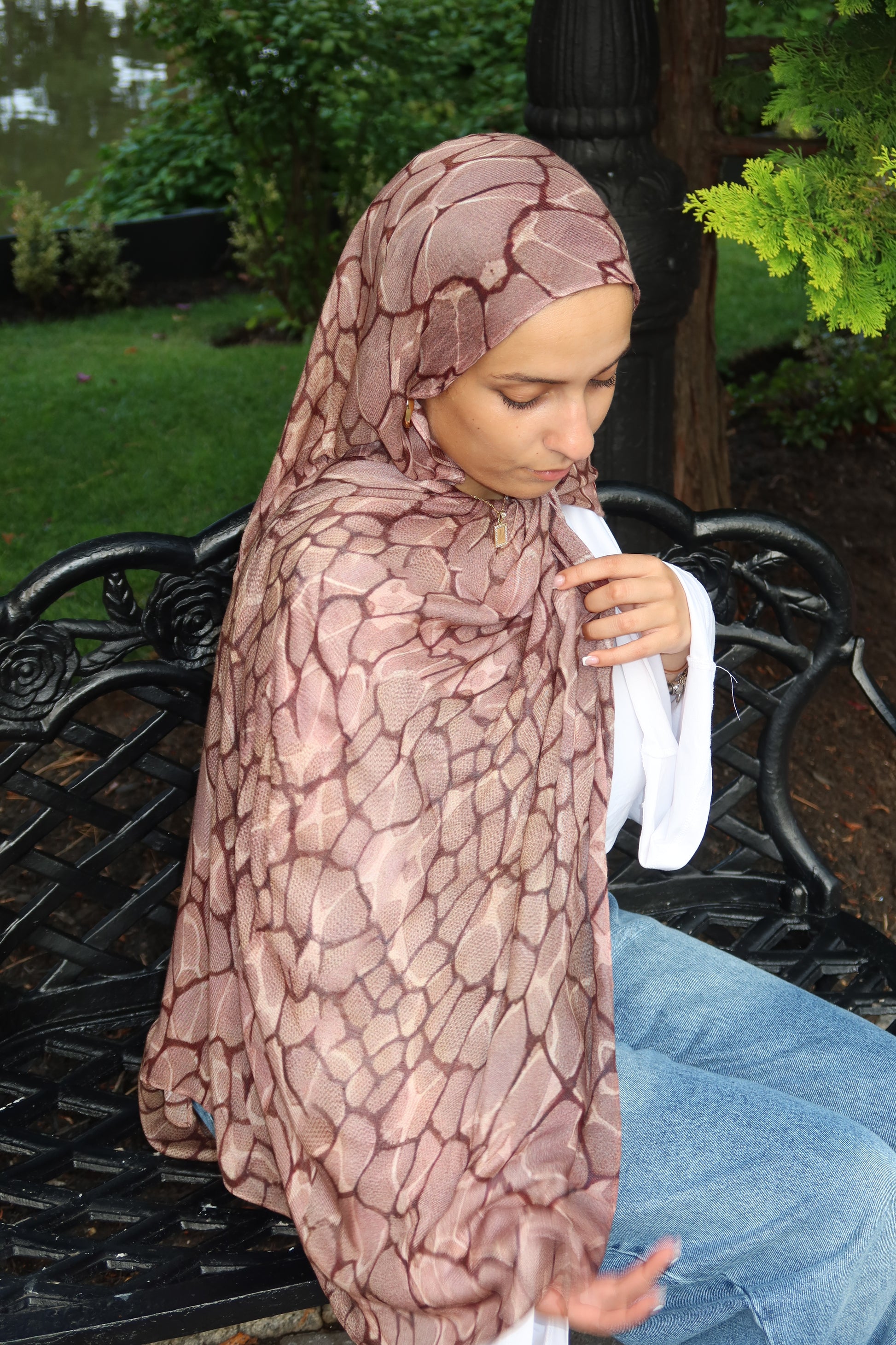 Blushing Bronze Crocodile: 💗🤎 A Warm Blushing Bronze Shade Paired With A Bold Crocodile Print Design Makes This Hijab Stand Out Beautifully. The Intricate Detailing Creates A Luxe Finish That Elevates Any Look! This Prints Is Absolutely Stunning And A Must Have!