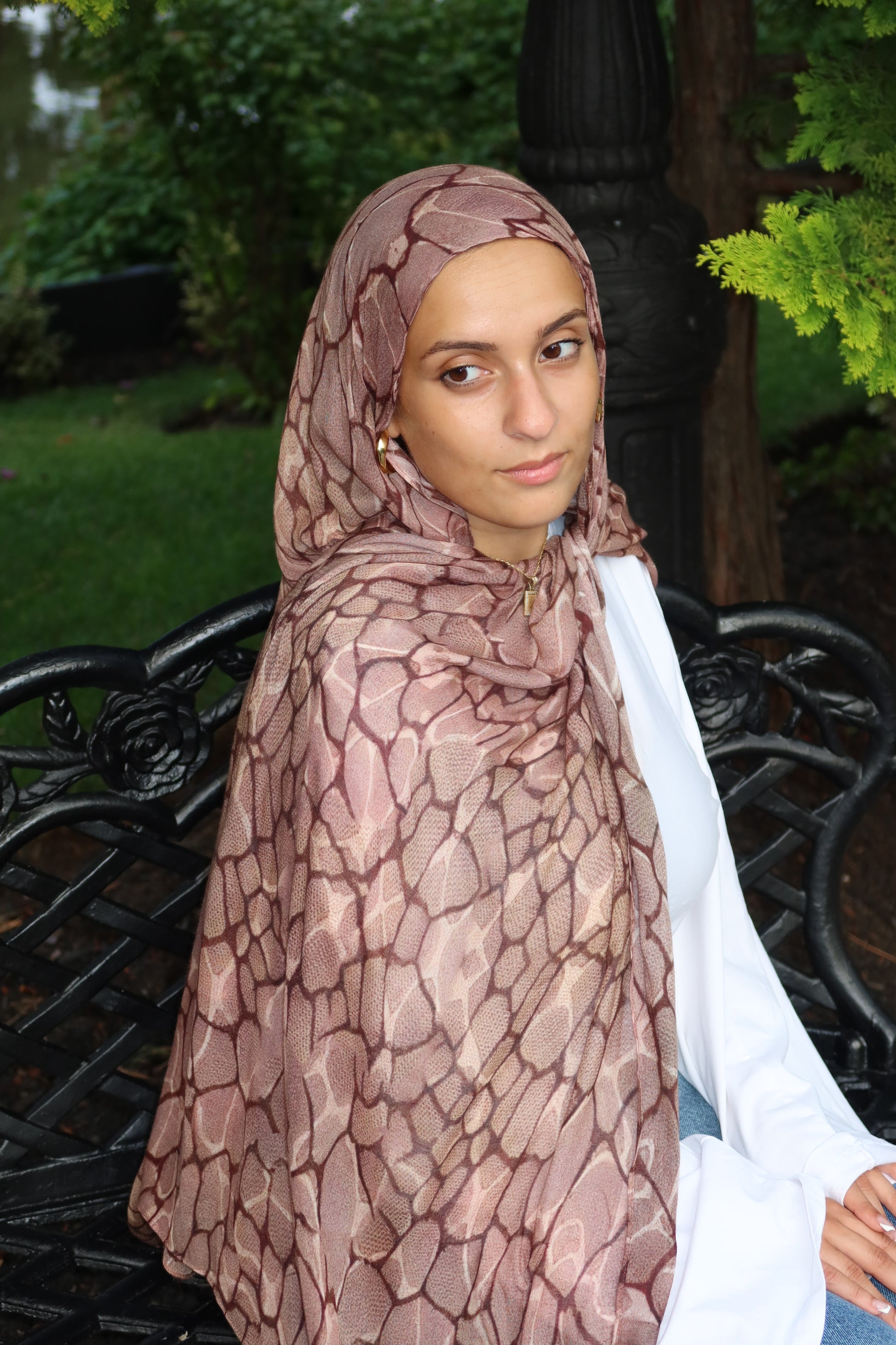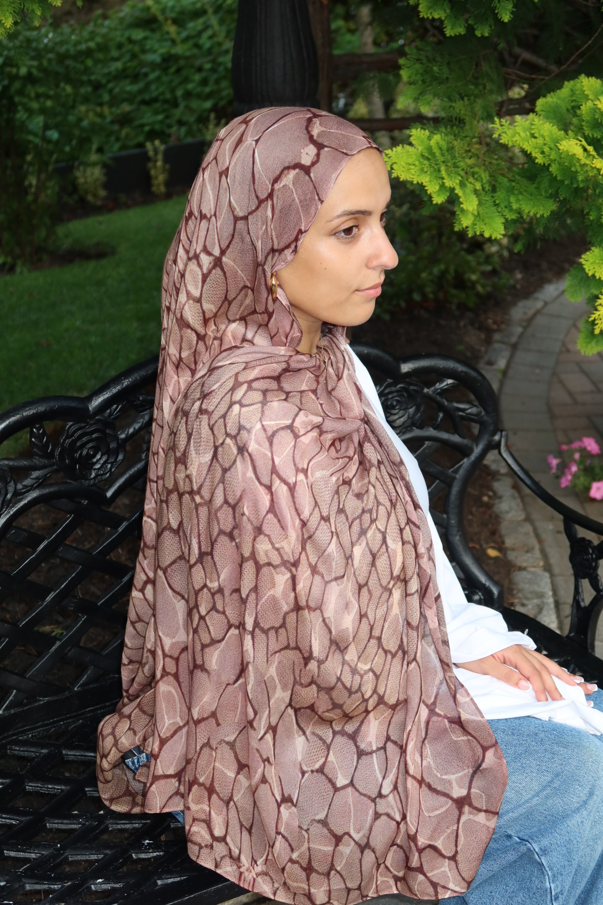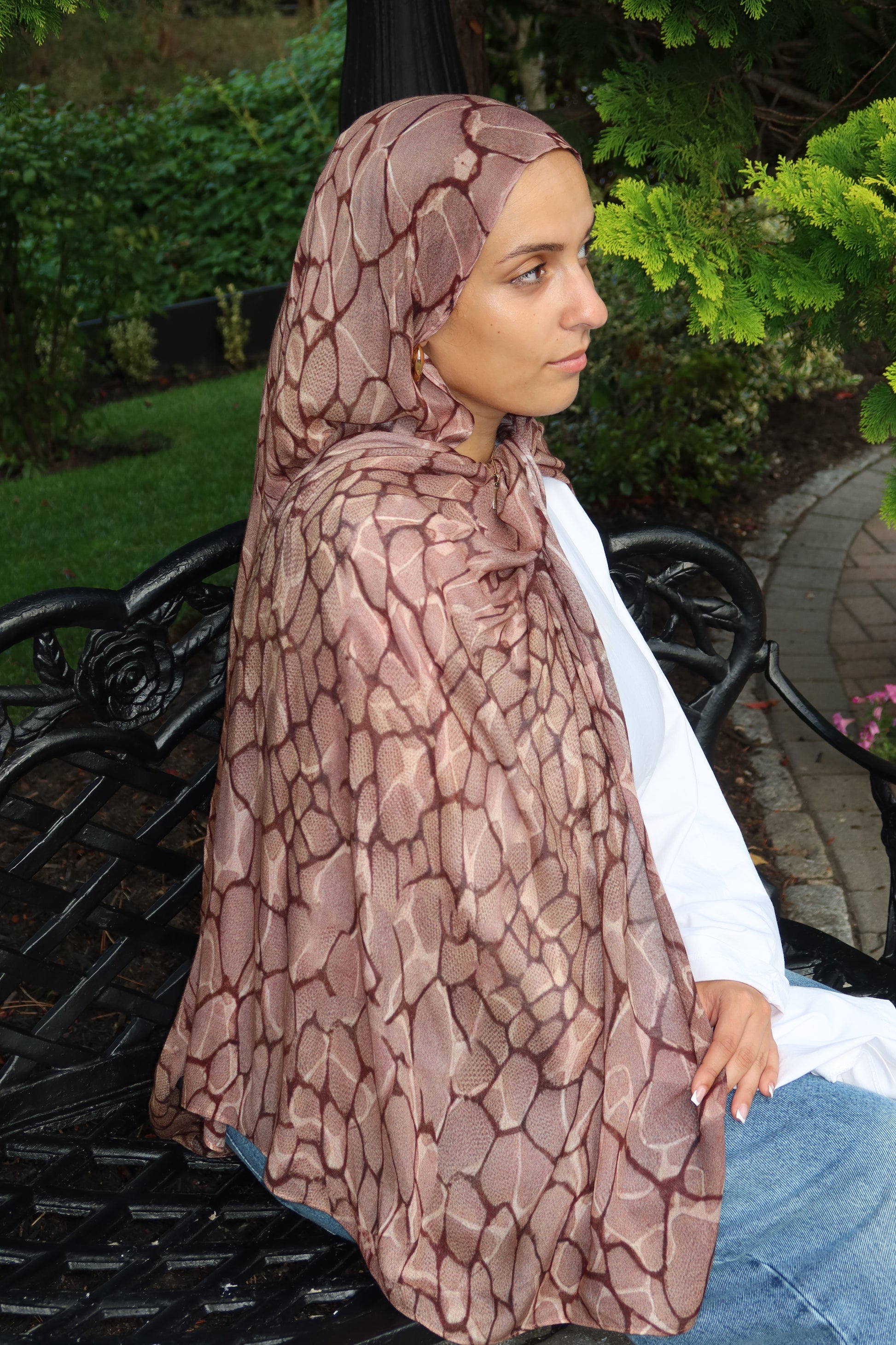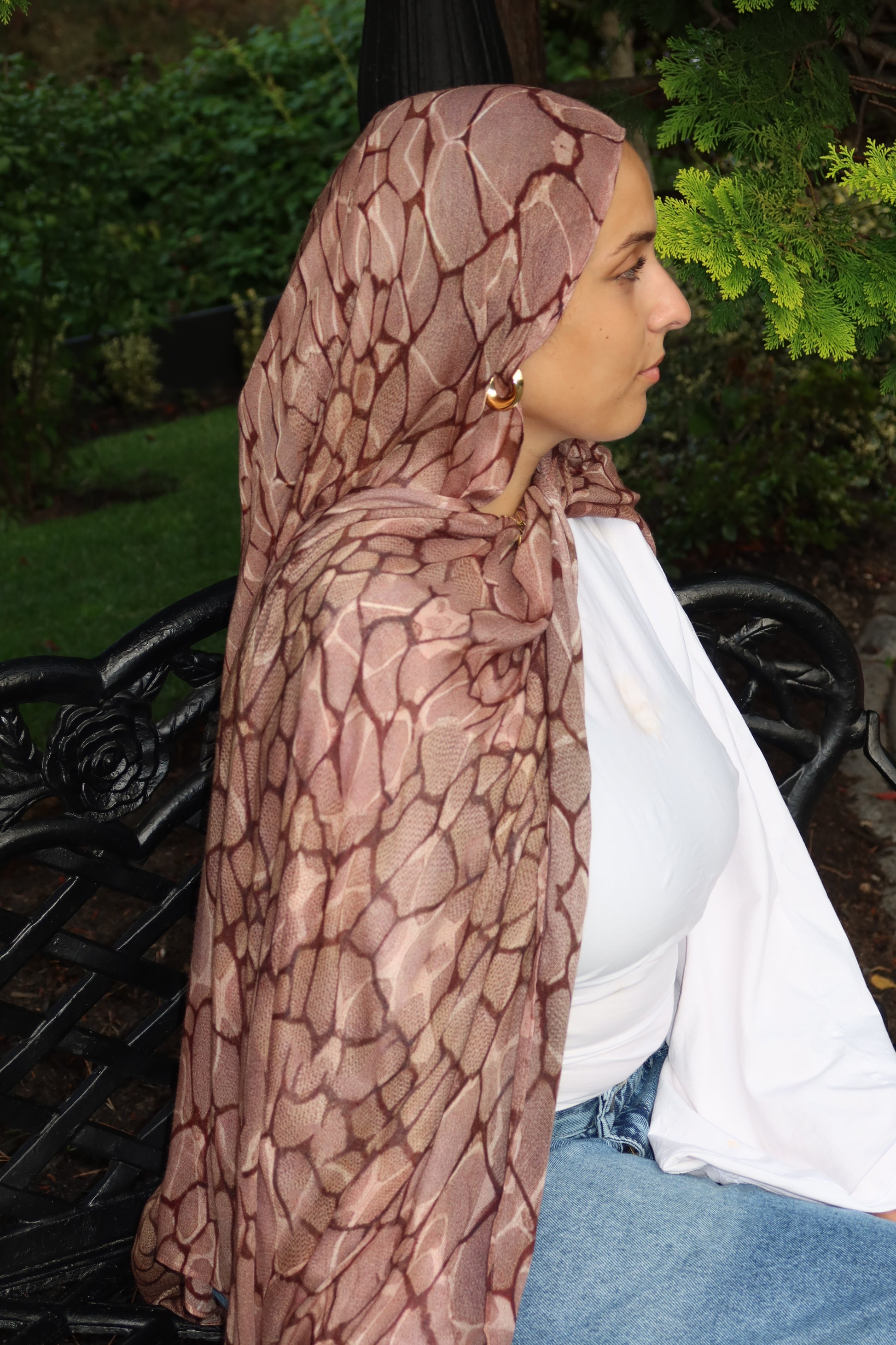 Blushing Bronze Crocodile: 💗🤎 A Warm Blushing Bronze Shade Paired With A Bold Crocodile Print Design Makes This Hijab Stand Out Beautifully. The Intricate Detailing Creates A Luxe Finish That Elevates Any Look! This Prints Is Absolutely Stunning And A Must Have!