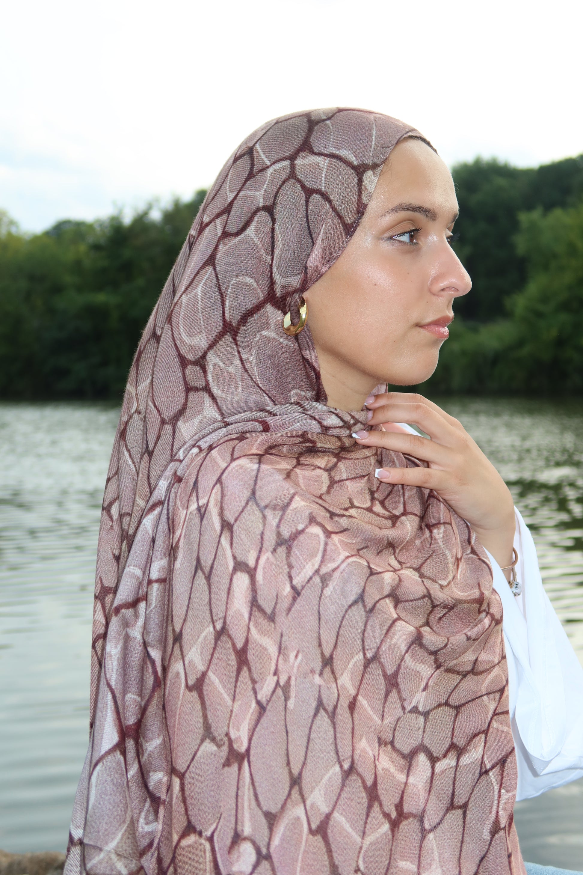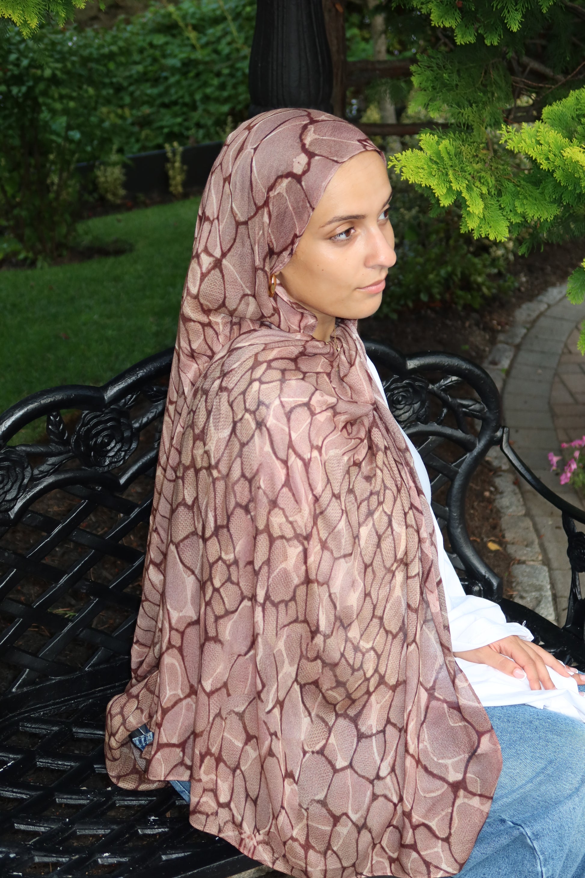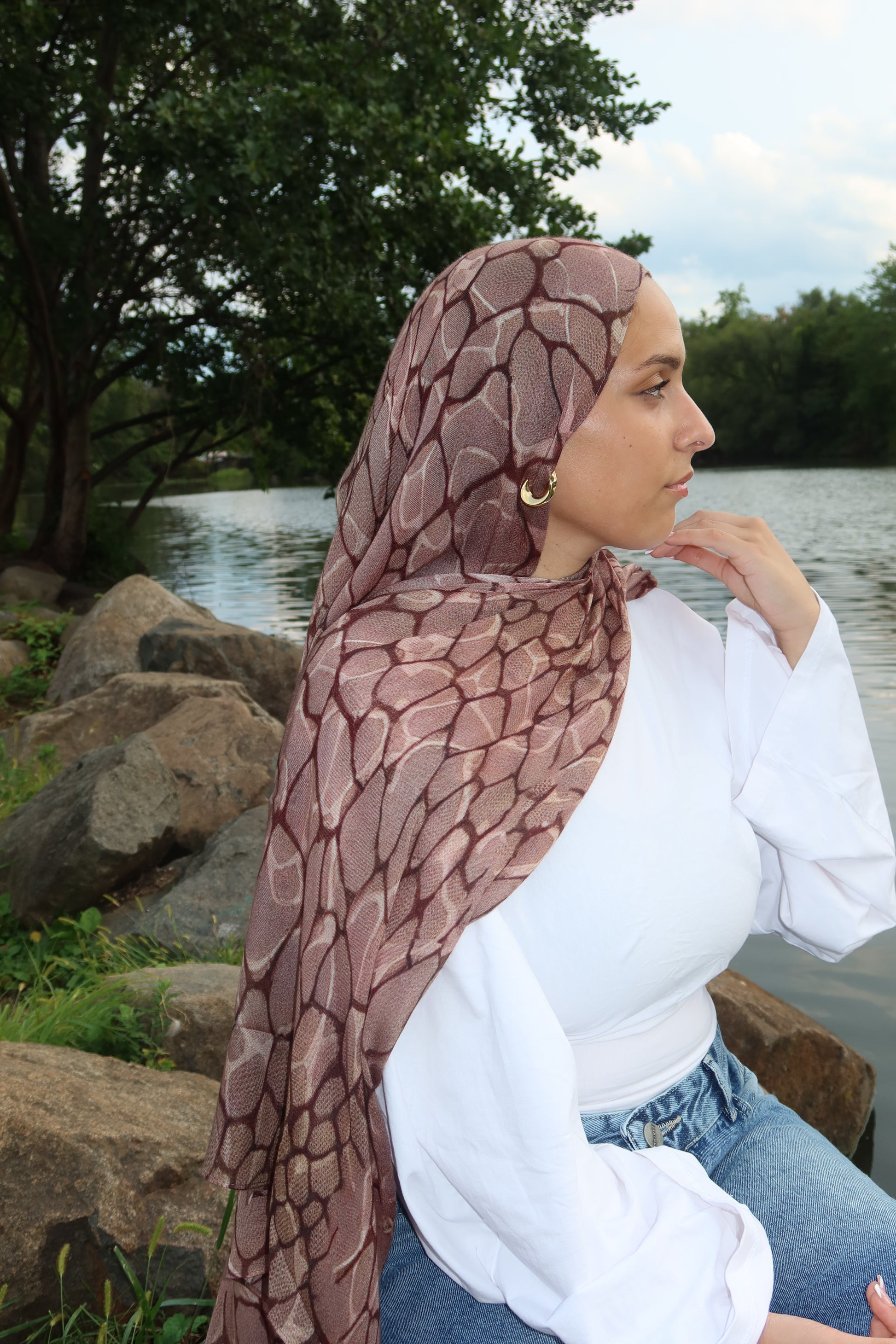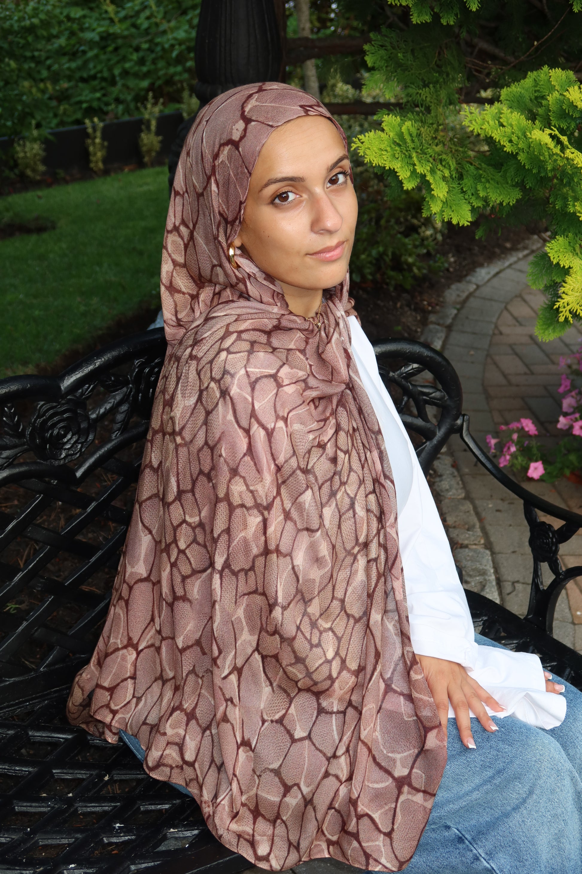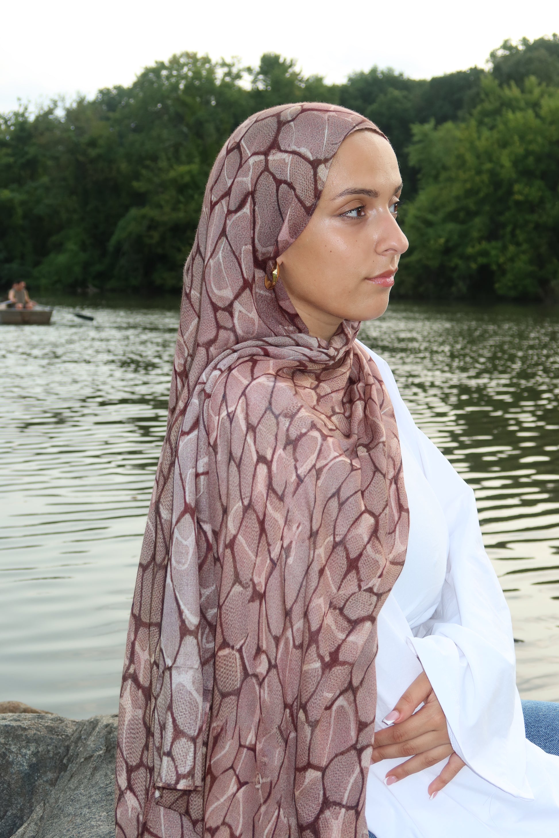 Blushing Bronze Crocodile: 💗🤎 A Warm Blushing Bronze Shade Paired With A Bold Crocodile Print Design Makes This Hijab Stand Out Beautifully. The Intricate Detailing Creates A Luxe Finish That Elevates Any Look! This Prints Is Absolutely Stunning And A Must Have!