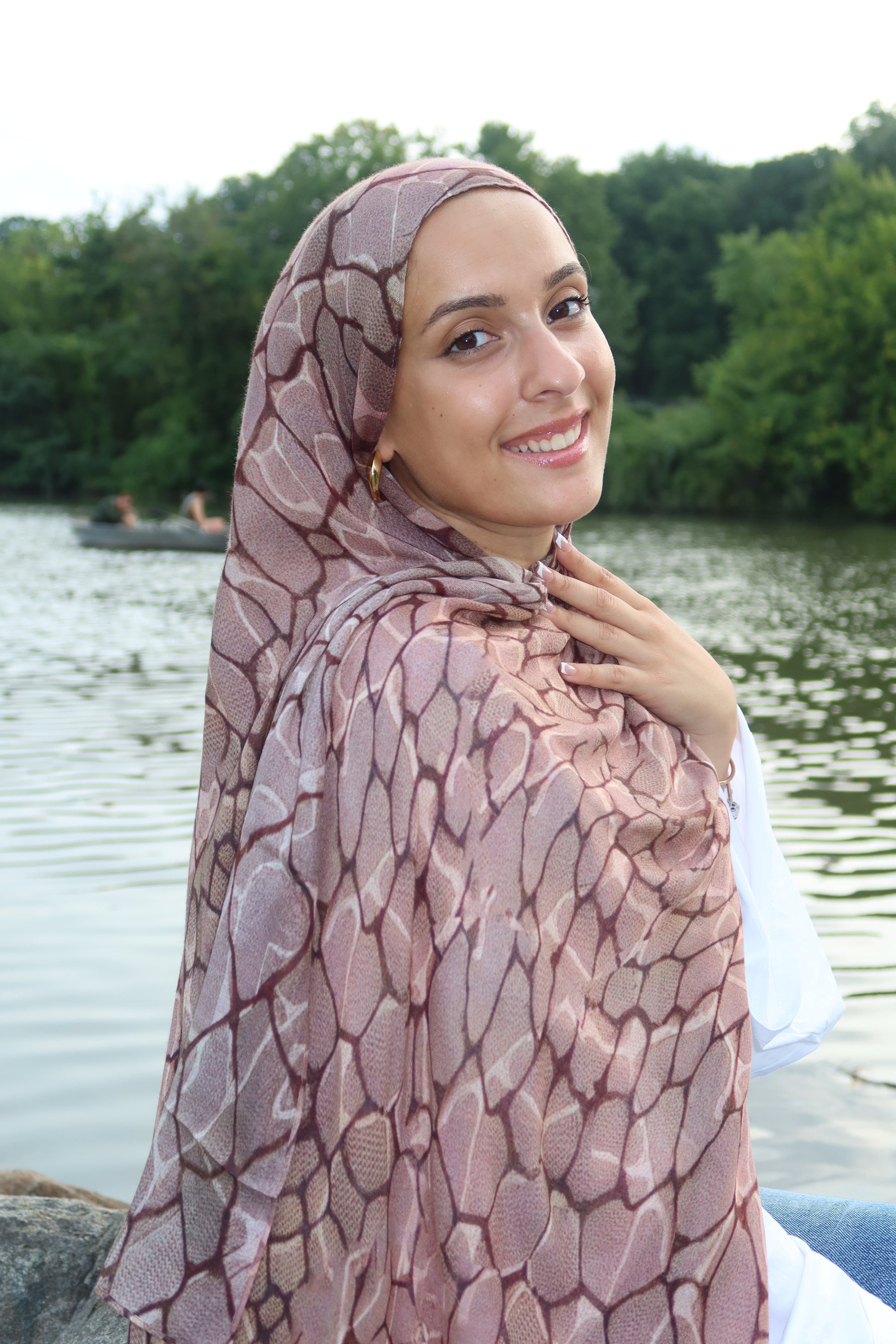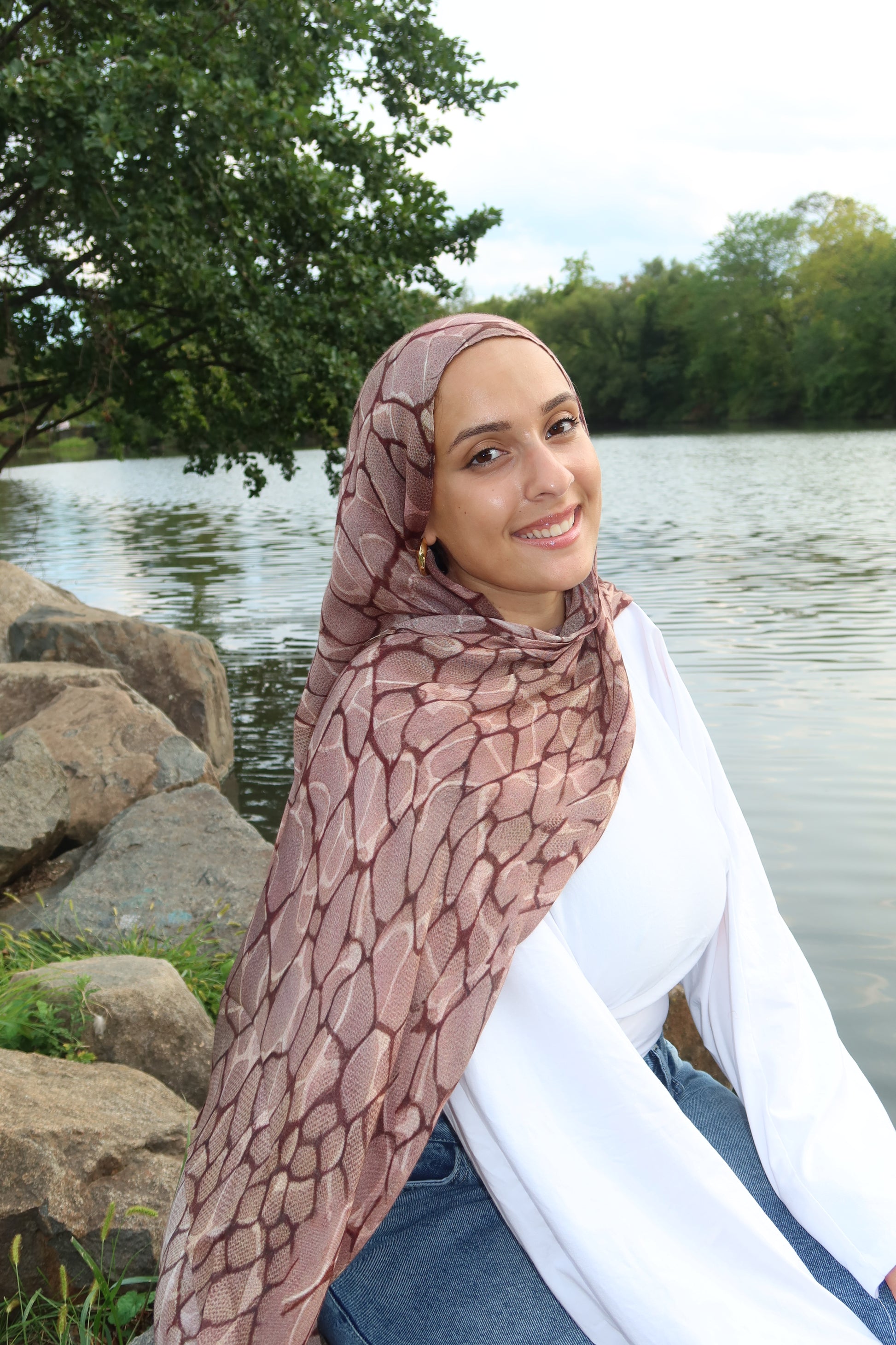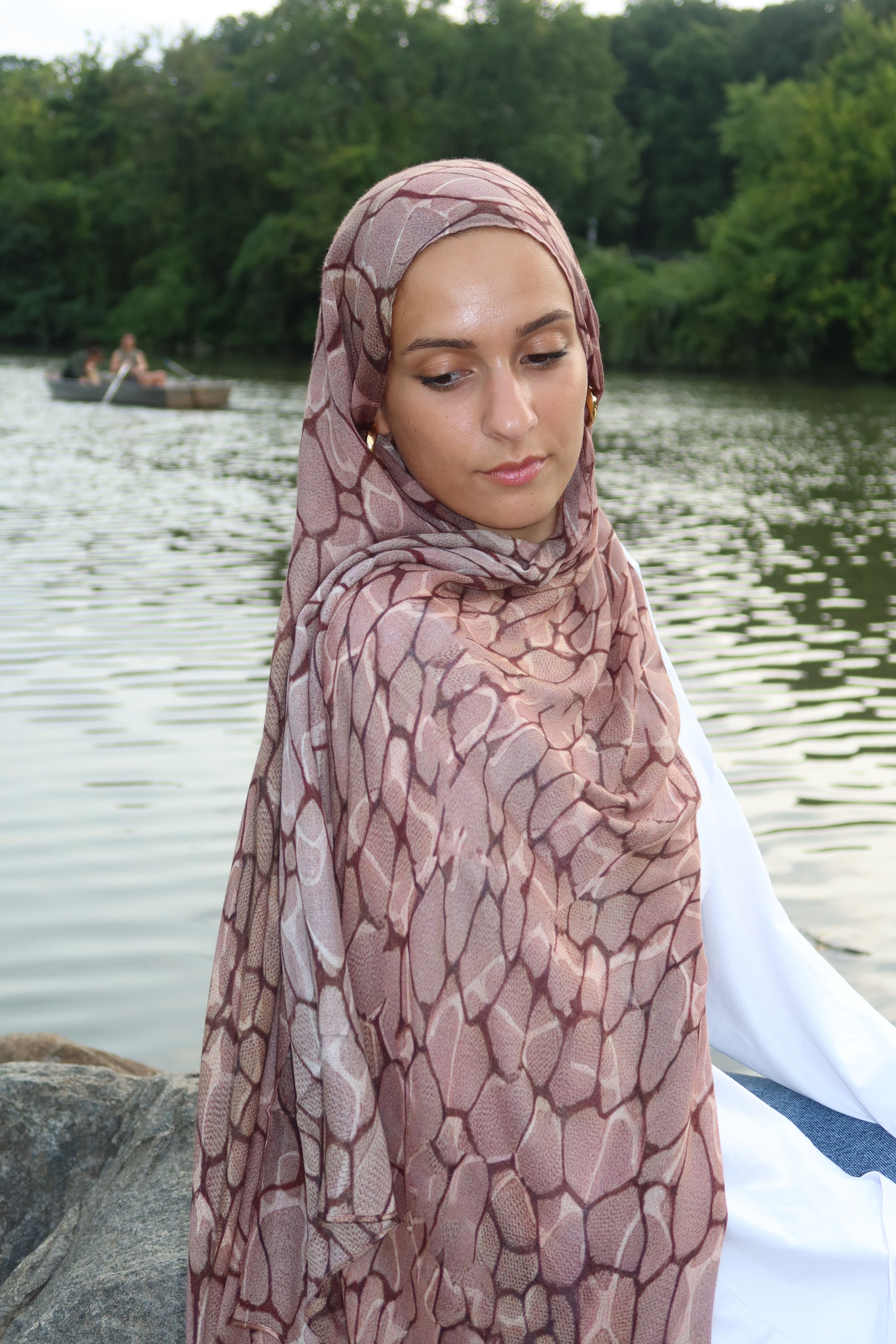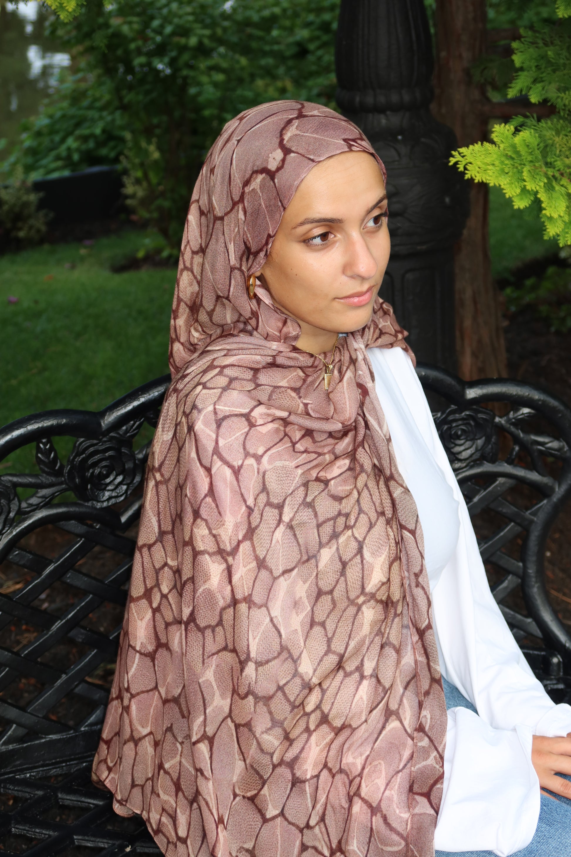 Blushing Bronze Crocodile: 💗🤎 A Warm Blushing Bronze Shade Paired With A Bold Crocodile Print Design Makes This Hijab Stand Out Beautifully. The Intricate Detailing Creates A Luxe Finish That Elevates Any Look! This Prints Is Absolutely Stunning And A Must Have!