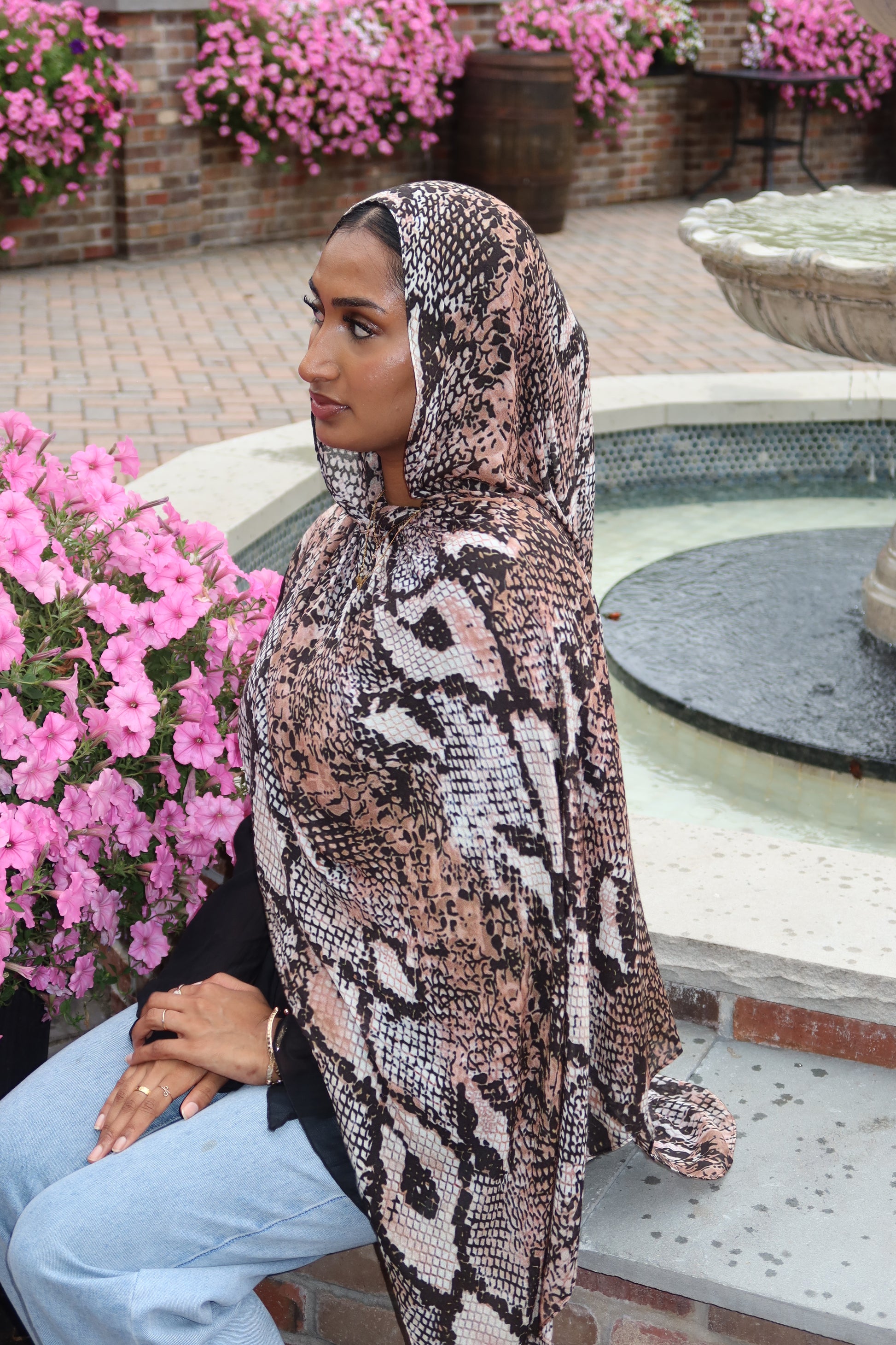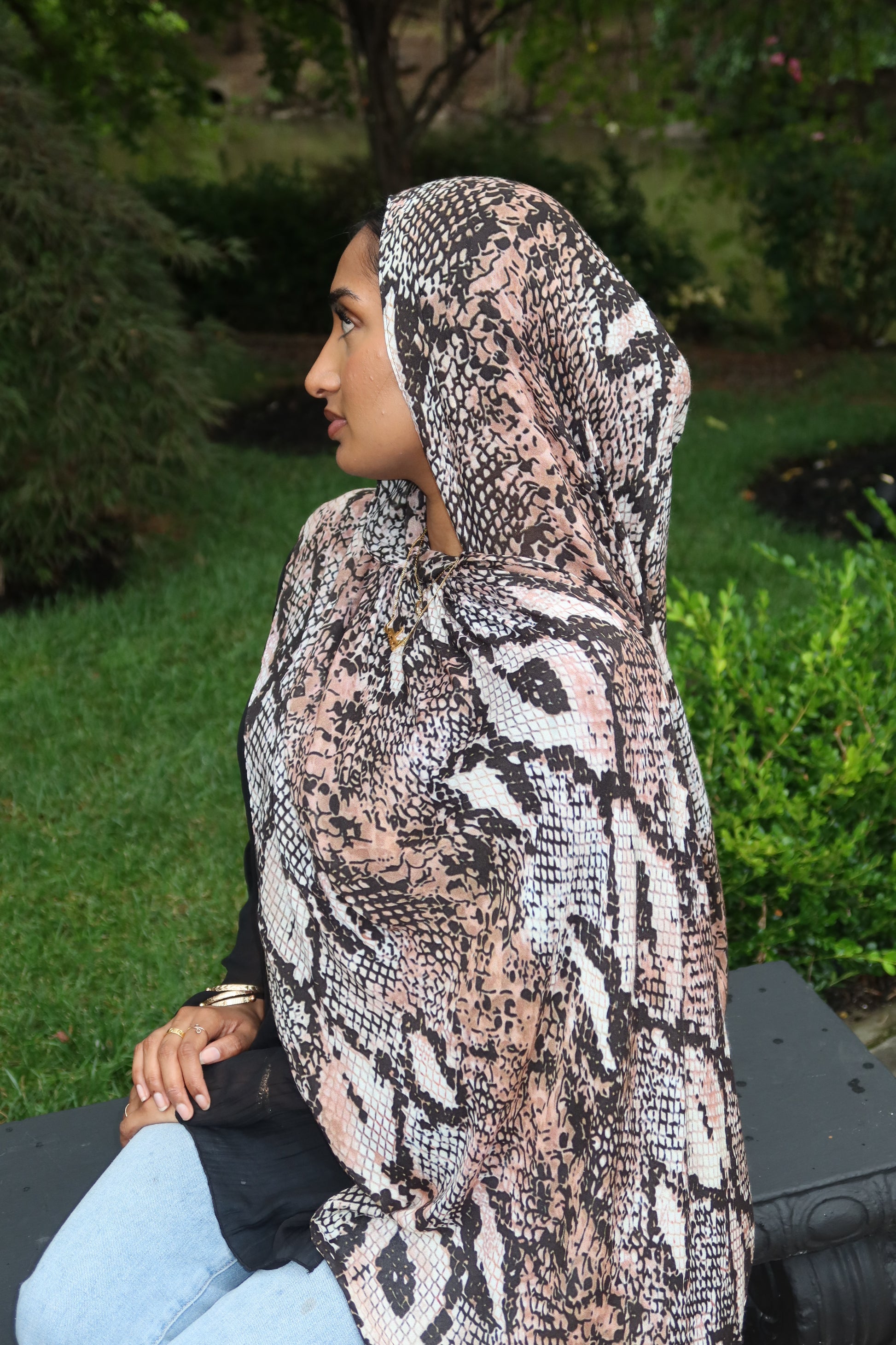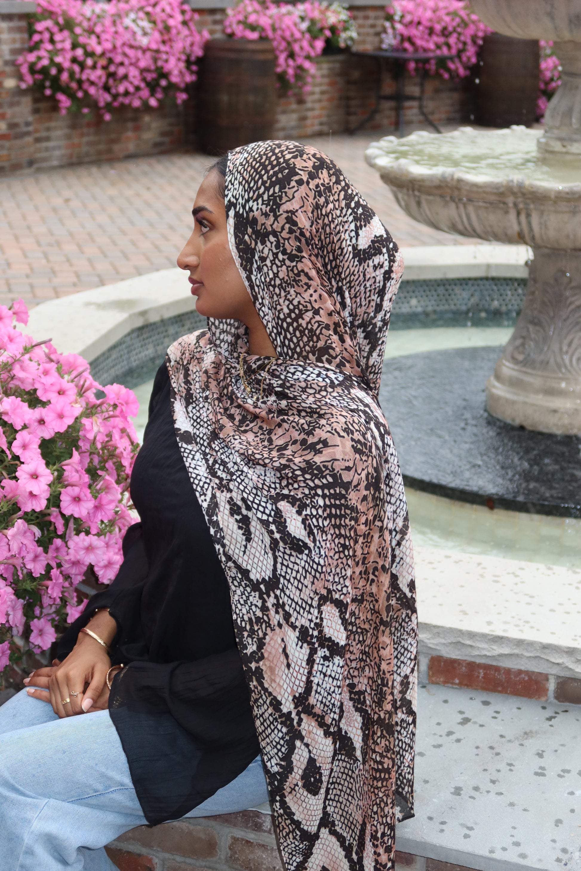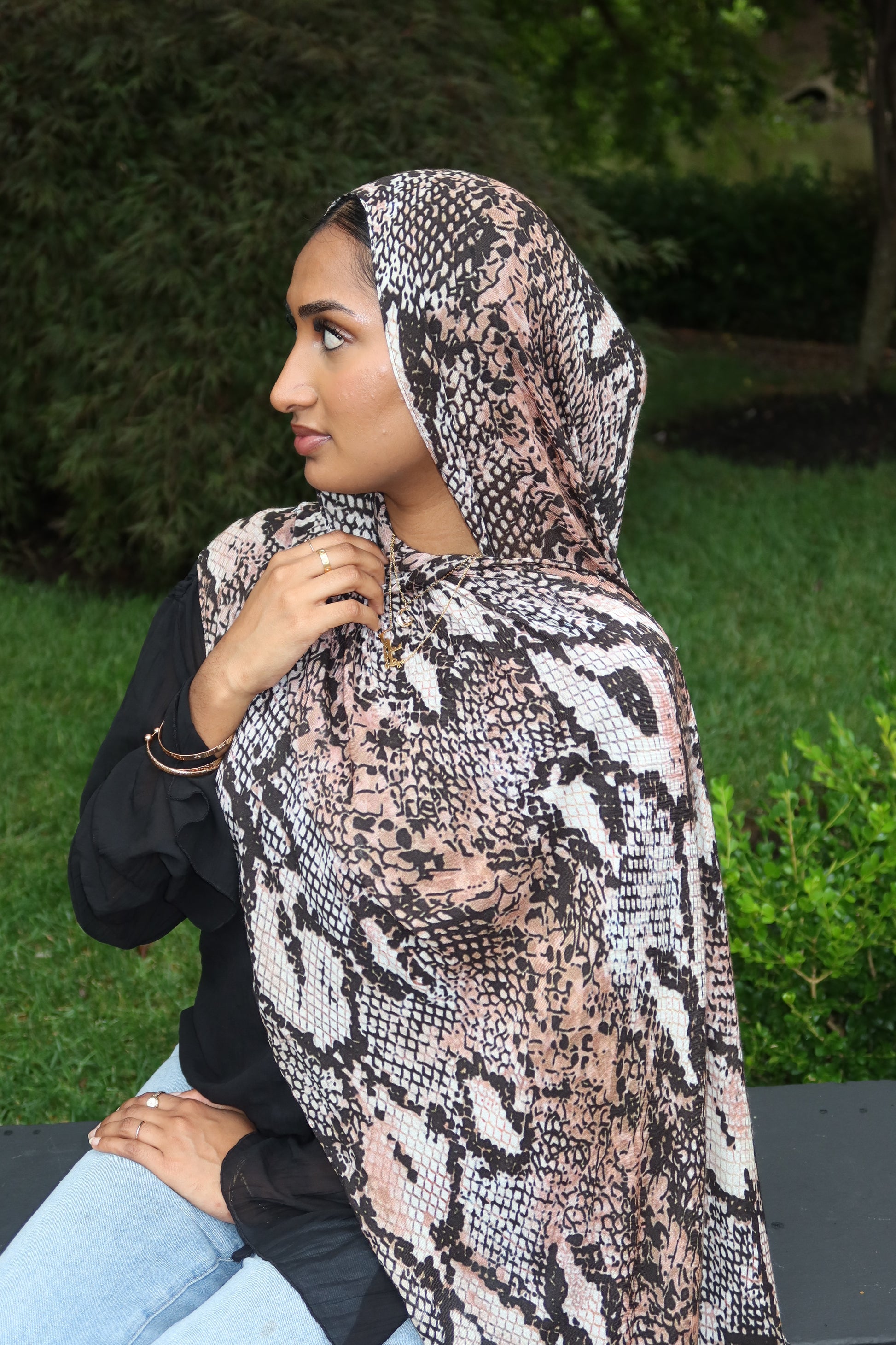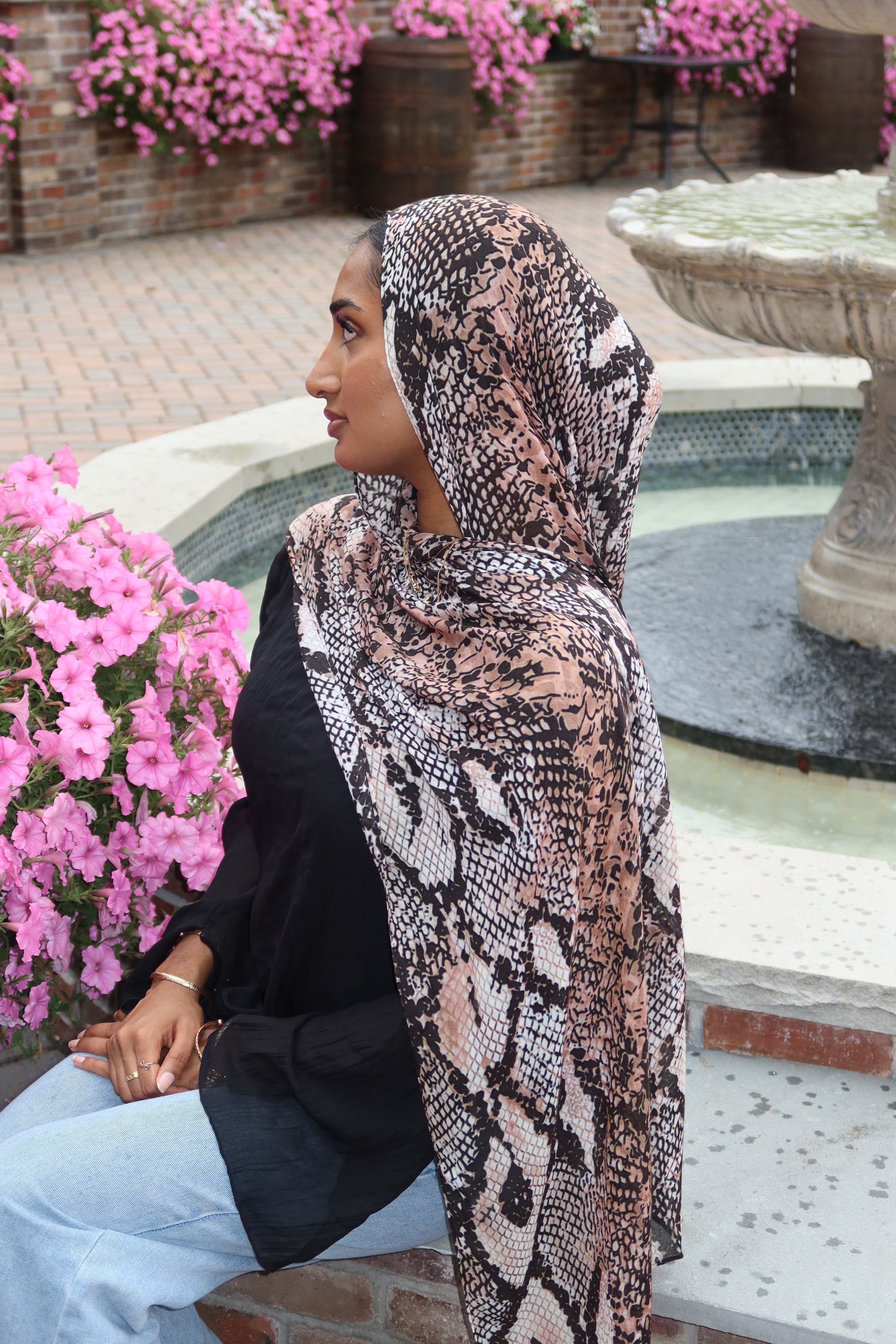 Rosewood Python: 🤎🖤🌸 A Bold And Elegant Snake-Print Design Featuring Scales In Shades Of Sandy Beige, Soft Blush Peach, And Warm Taupe, Perfectly Blended To Create A Natural And Luxurious Look. Deep Black Accents Outline The Pattern, Adding Striking Contrast And Depth. The Intricate Scale Details Flow Seamlessly Across The Hijab, Giving It A Chic And Timeless Appeal.