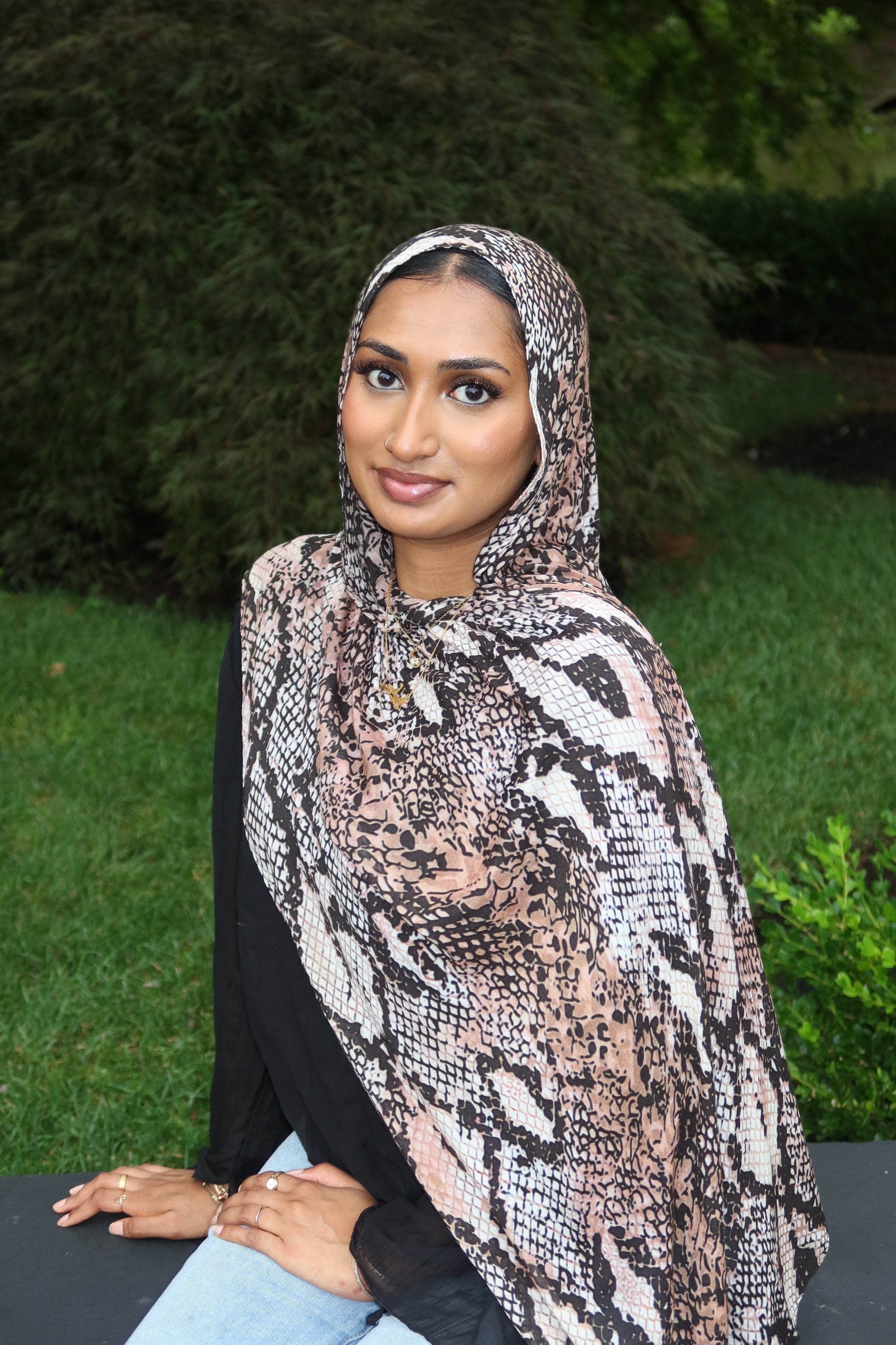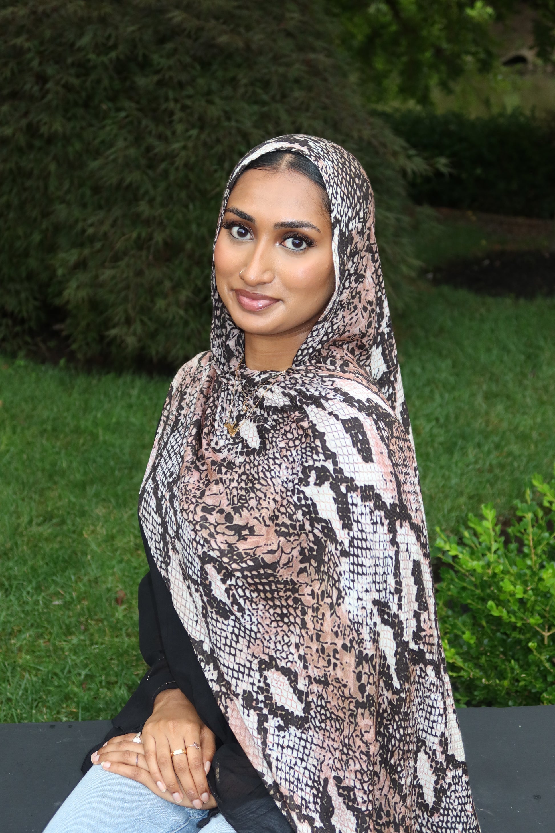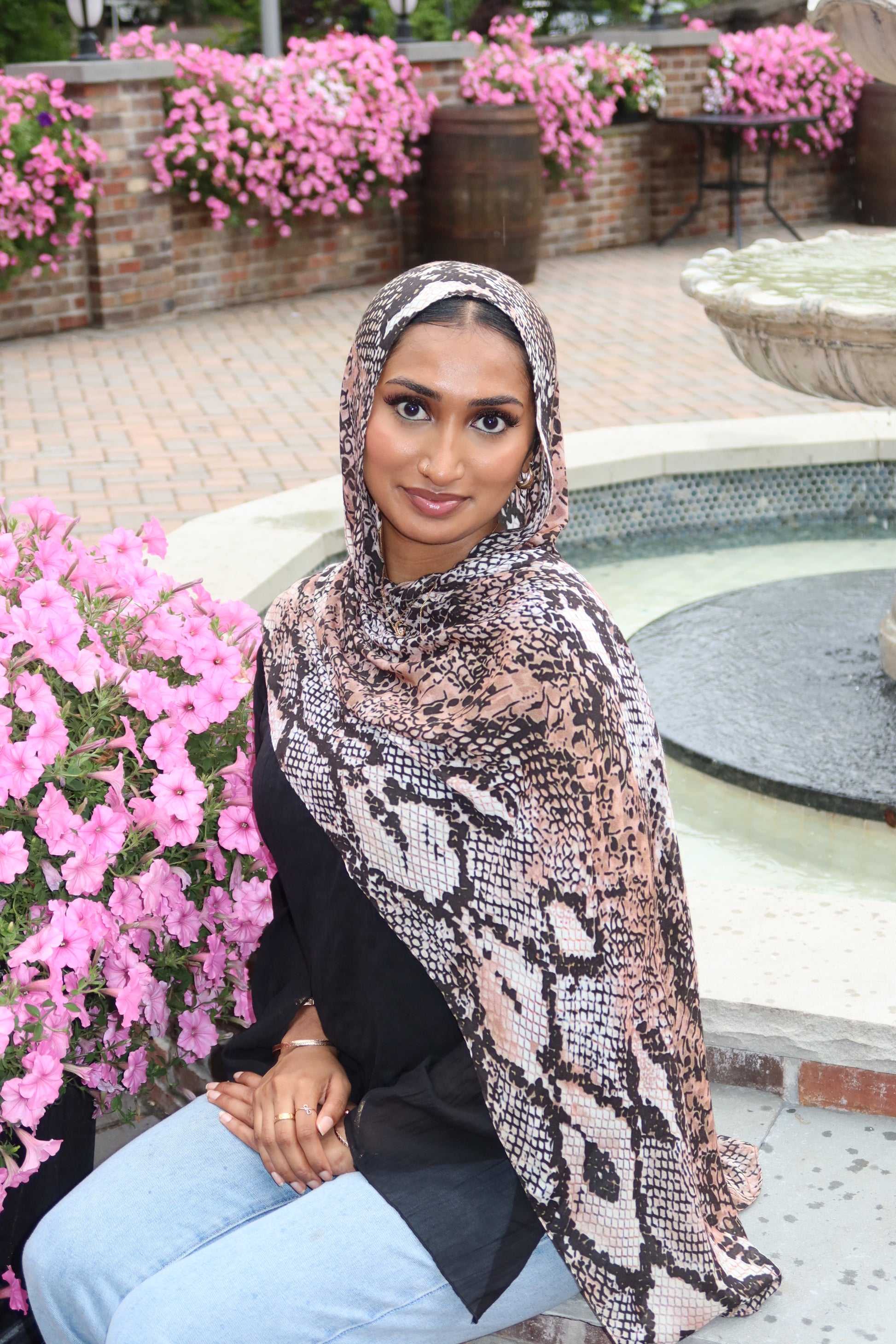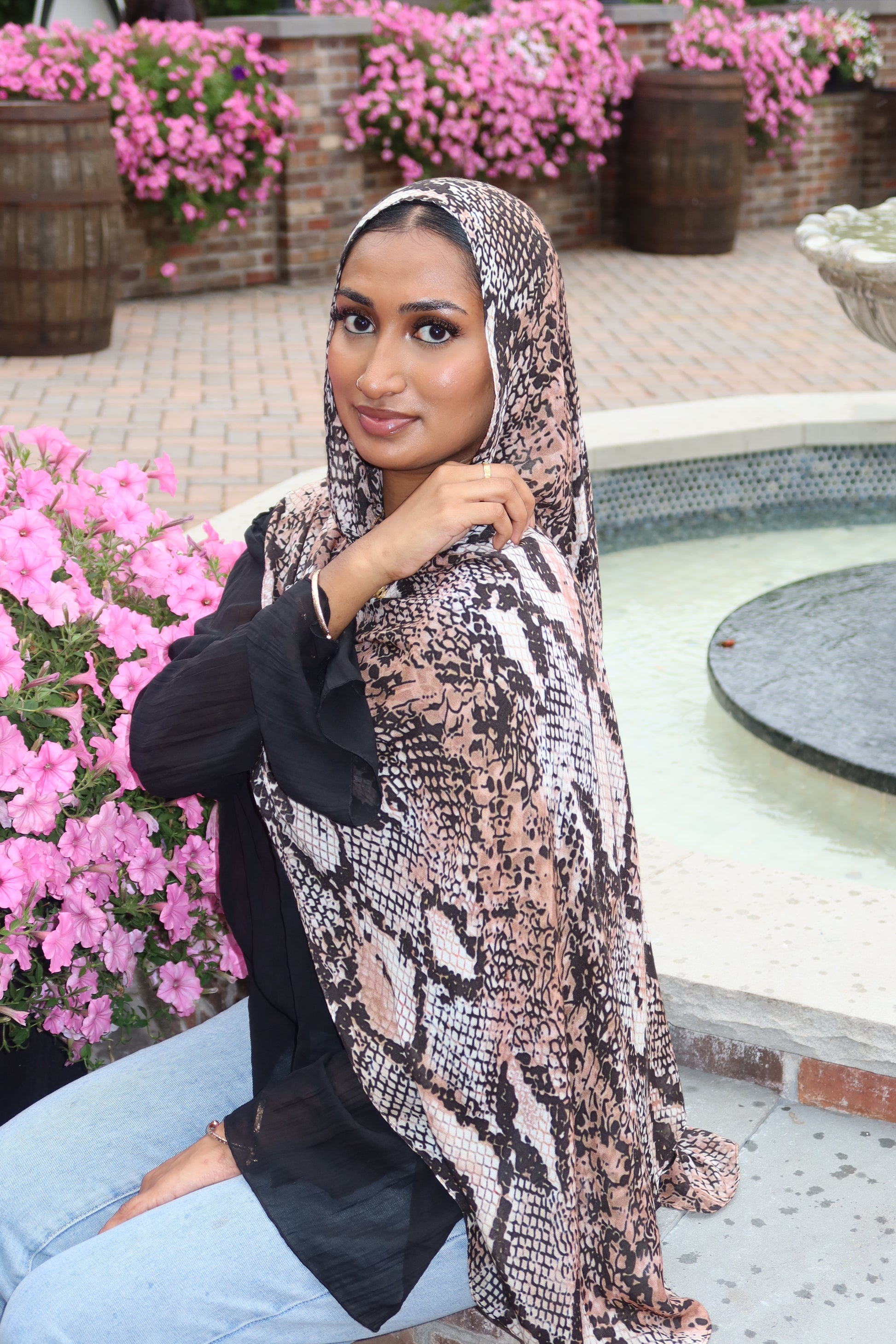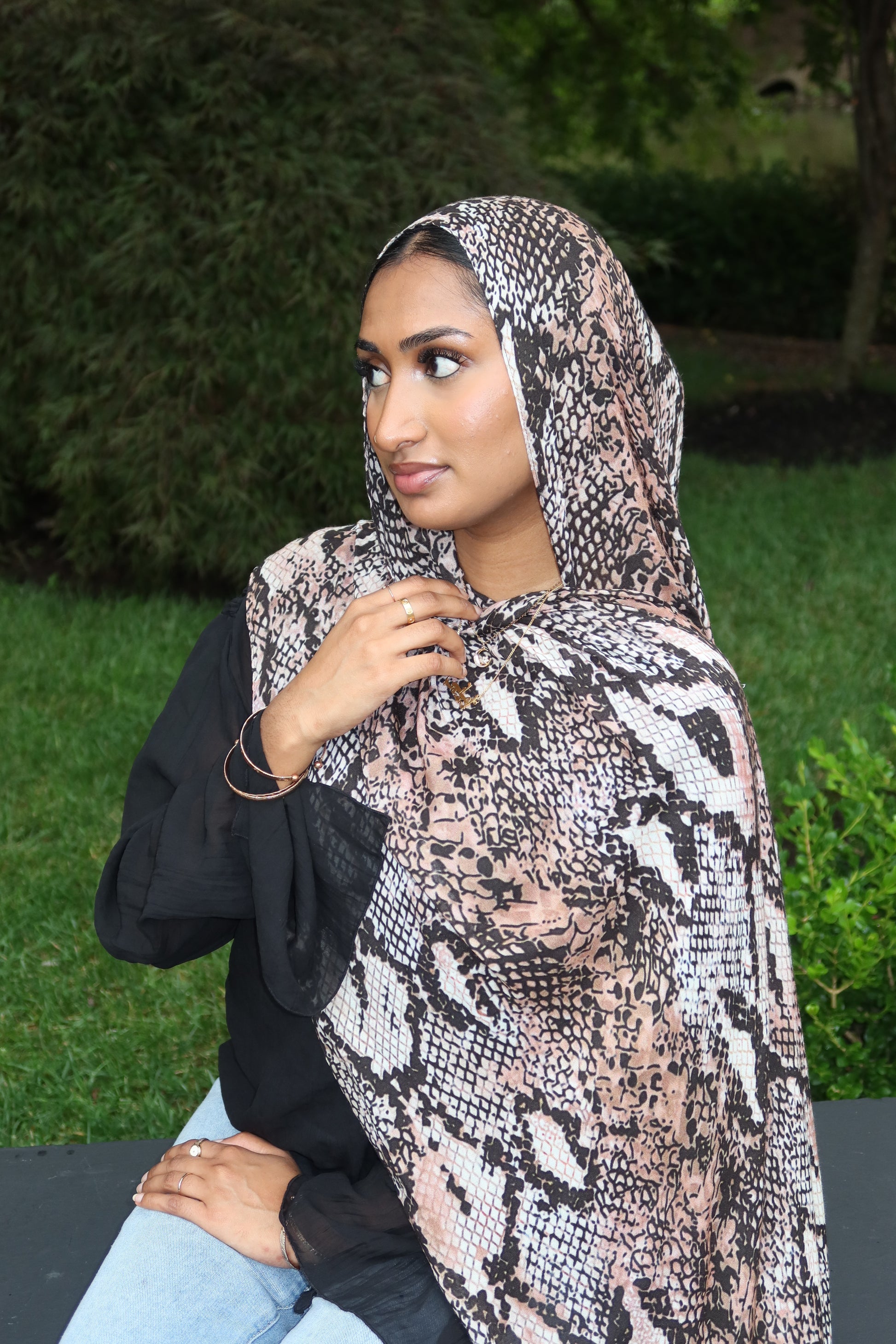 Rosewood Python: 🤎🖤🌸 A Bold And Elegant Snake-Print Design Featuring Scales In Shades Of Sandy Beige, Soft Blush Peach, And Warm Taupe, Perfectly Blended To Create A Natural And Luxurious Look. Deep Black Accents Outline The Pattern, Adding Striking Contrast And Depth. The Intricate Scale Details Flow Seamlessly Across The Hijab, Giving It A Chic And Timeless Appeal.